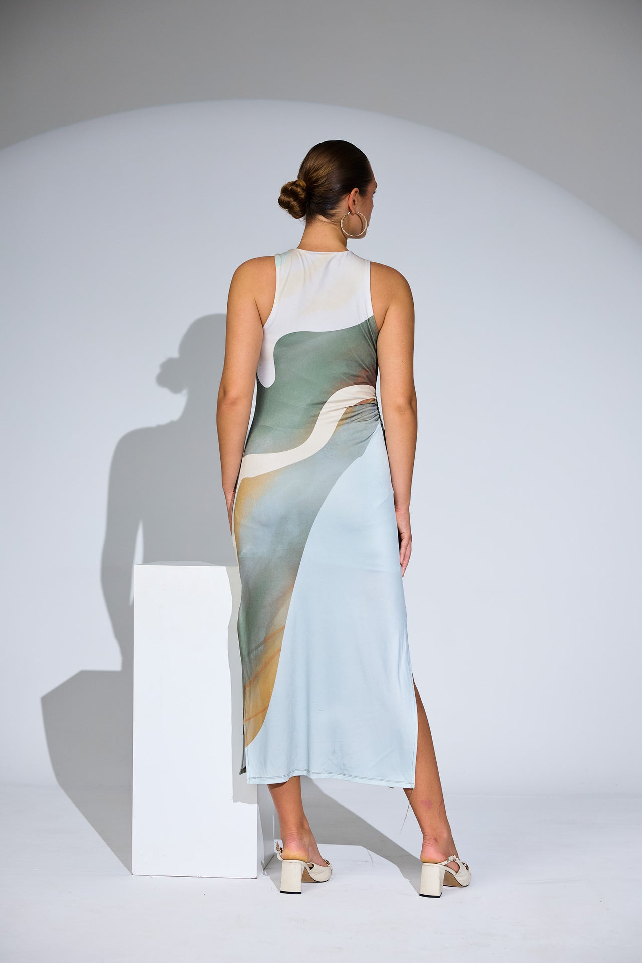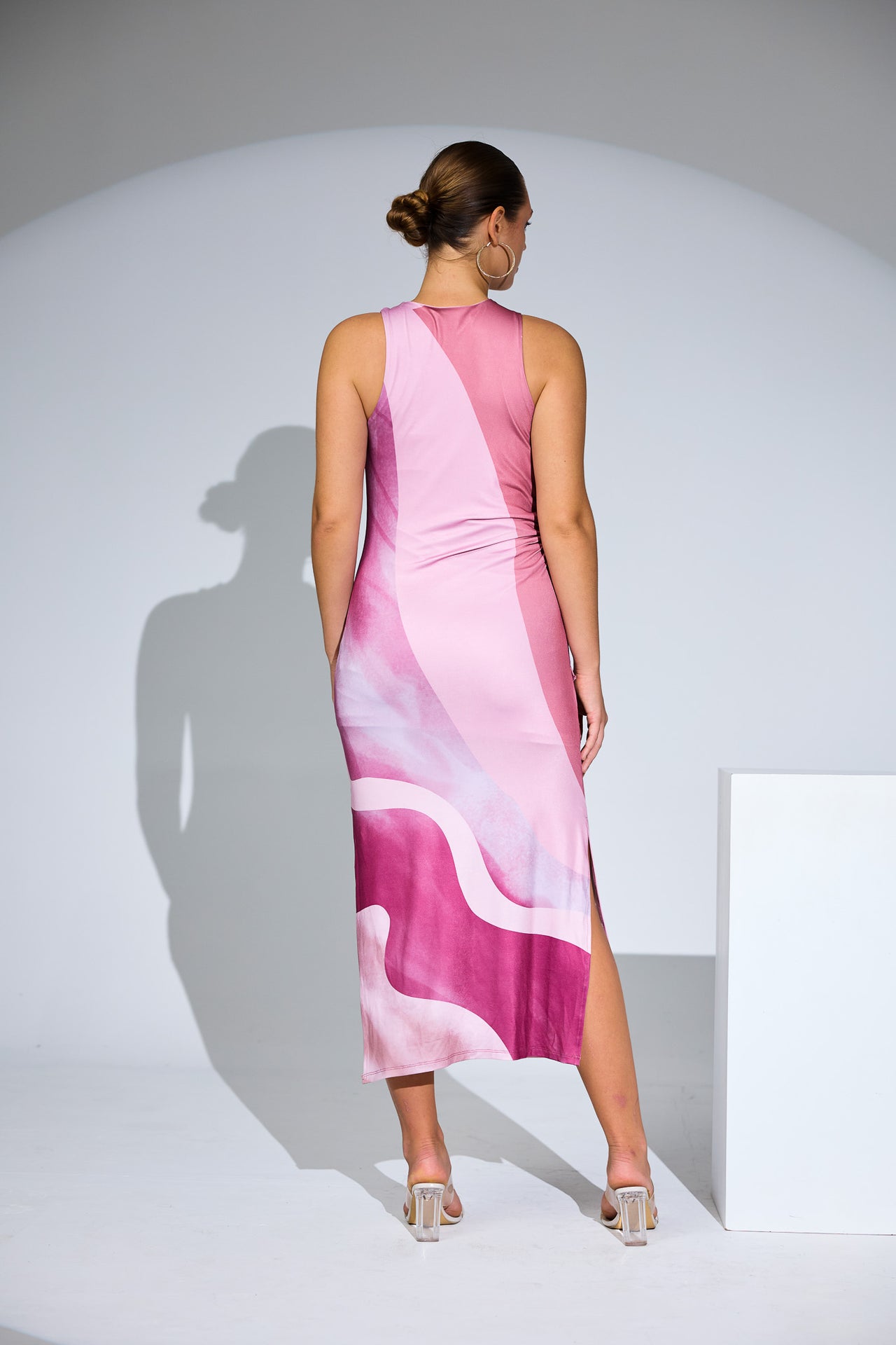 This sleeveless midi dress is a vibrant showcase of abstract modern art in soft pink, blush, light green and mauve tones. Designed with a sculpted fit, the dress features a gathered side cut-out with adjustable rushed detailing, adding a sultry silhouette while maintaining sophistication. The smooth, lightweight fabric skims the body, and the high neckline contrasts beautifully with the dramatic side slit, creating a sleek, evening-ready statement. As styling Options, Sleek gold or silver hoops, or opt for crystal drops with minimal accessories can be use since the neckline is high. Perfect for, Cocktail parties, semi-formal evening weddings, fashion Events or Art Shows – which the abstract print gives it an artistic edge.