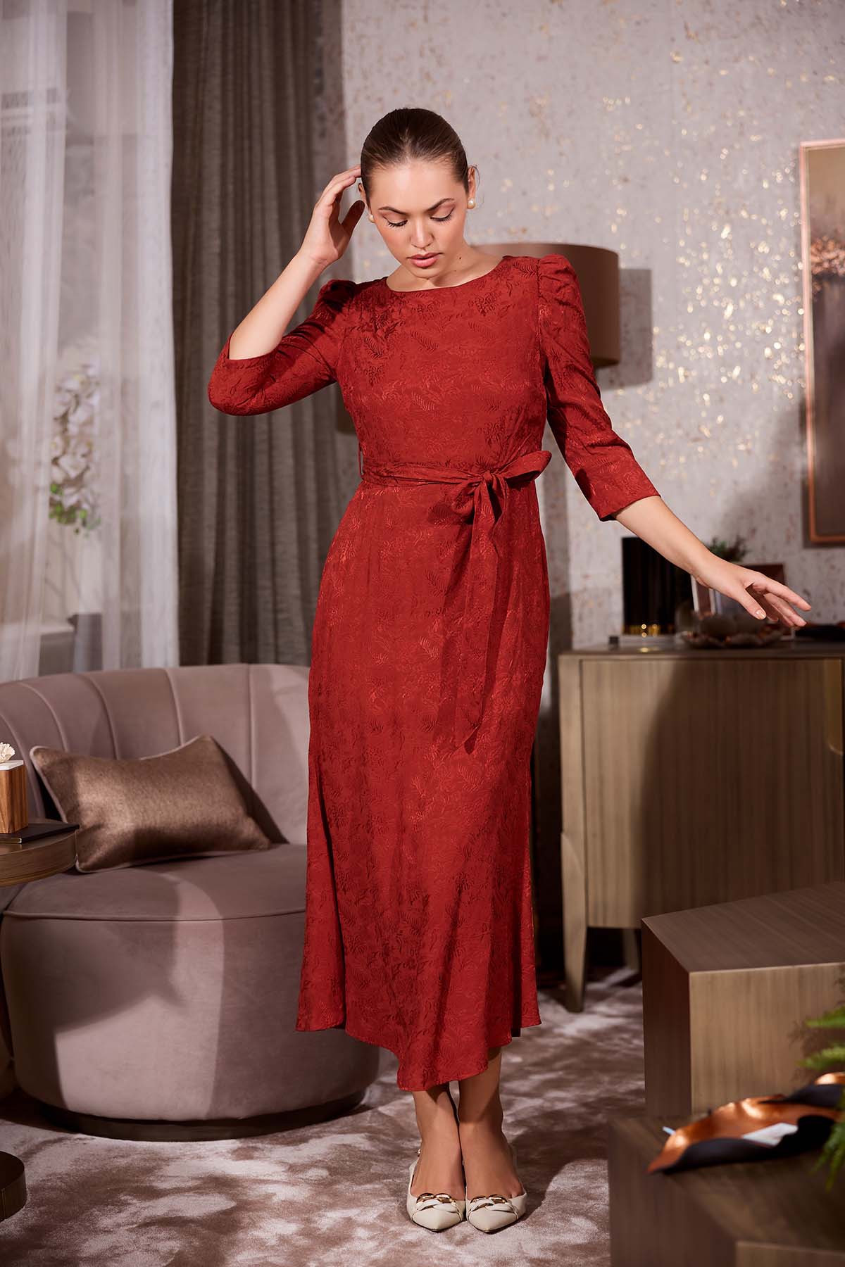 A refined silhouette meets rich texture in this dark-toned lace midi dress. Designed with a high boat neckline, three-quarter sleeves, and a flattering tie waist, it exudes timeless sophistication. The subtle sheen of the fabric adds a hint of luxury, making it the perfect choice for evening gatherings, formal dinners, or festive occasions.