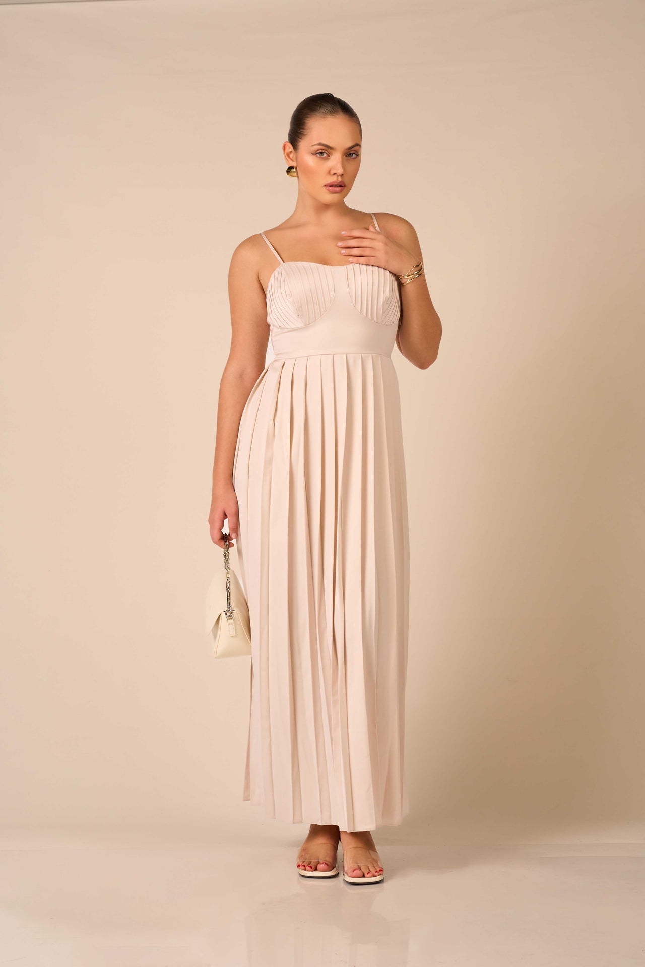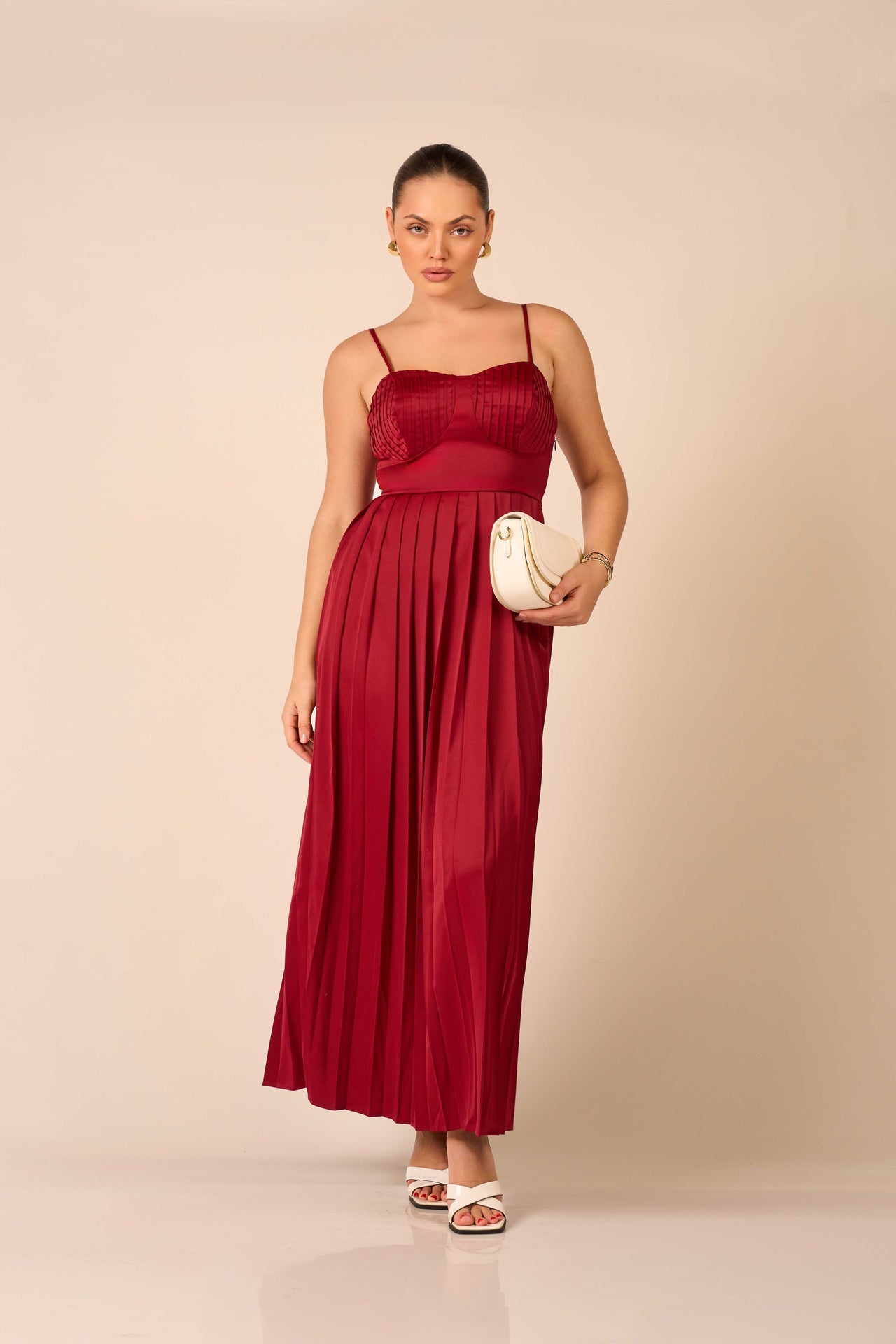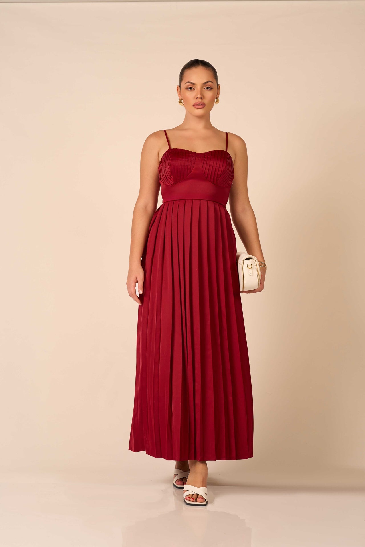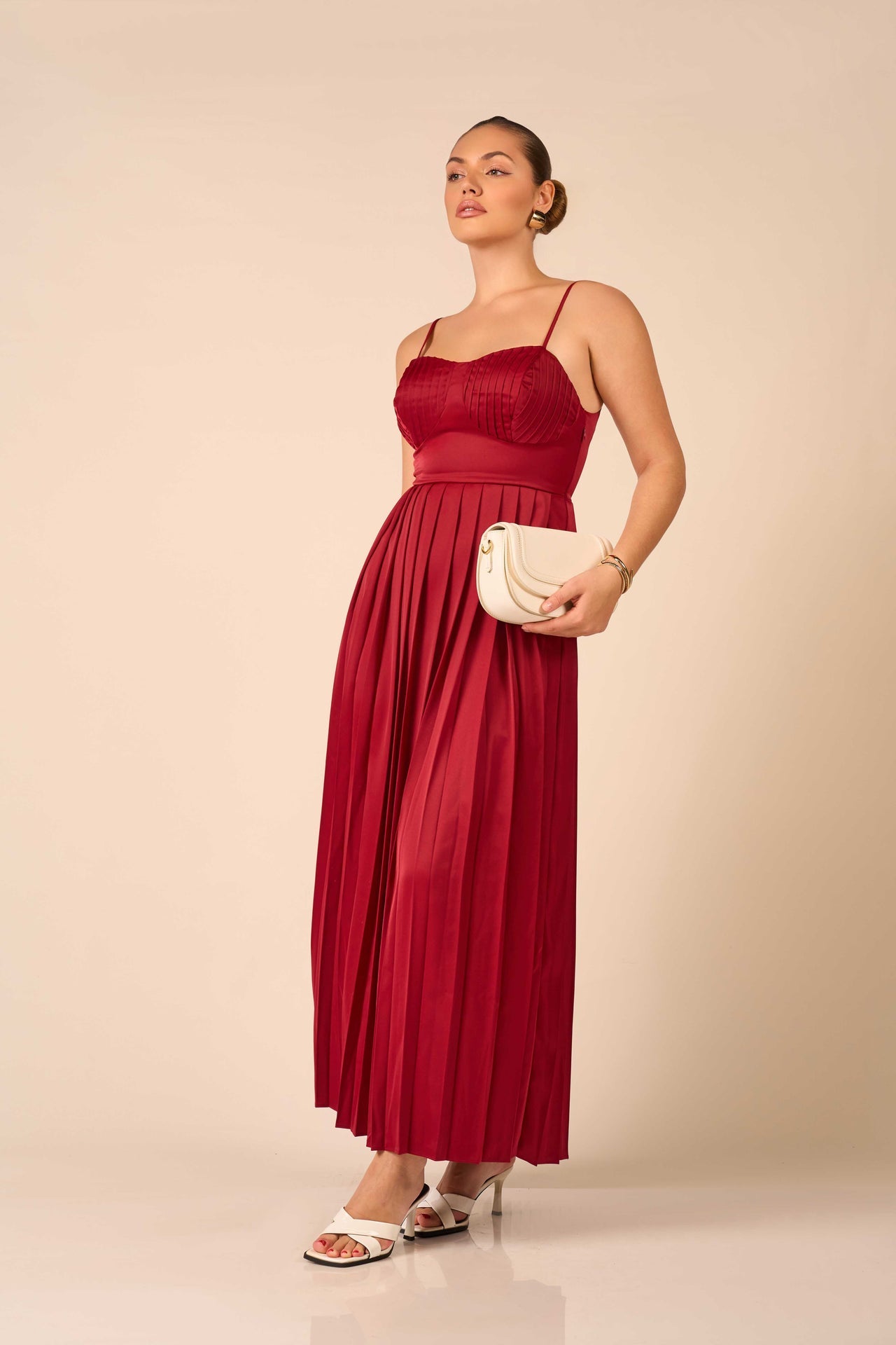 Elegant maxi-length evening dress crafted in luxurious sateen fabric, featuring a strappy pintuck-detail bodice that adds delicate texture and sophistication. The flowing pleated skirt creates graceful movement, making it a perfect choice for formal occasions and refined evening events