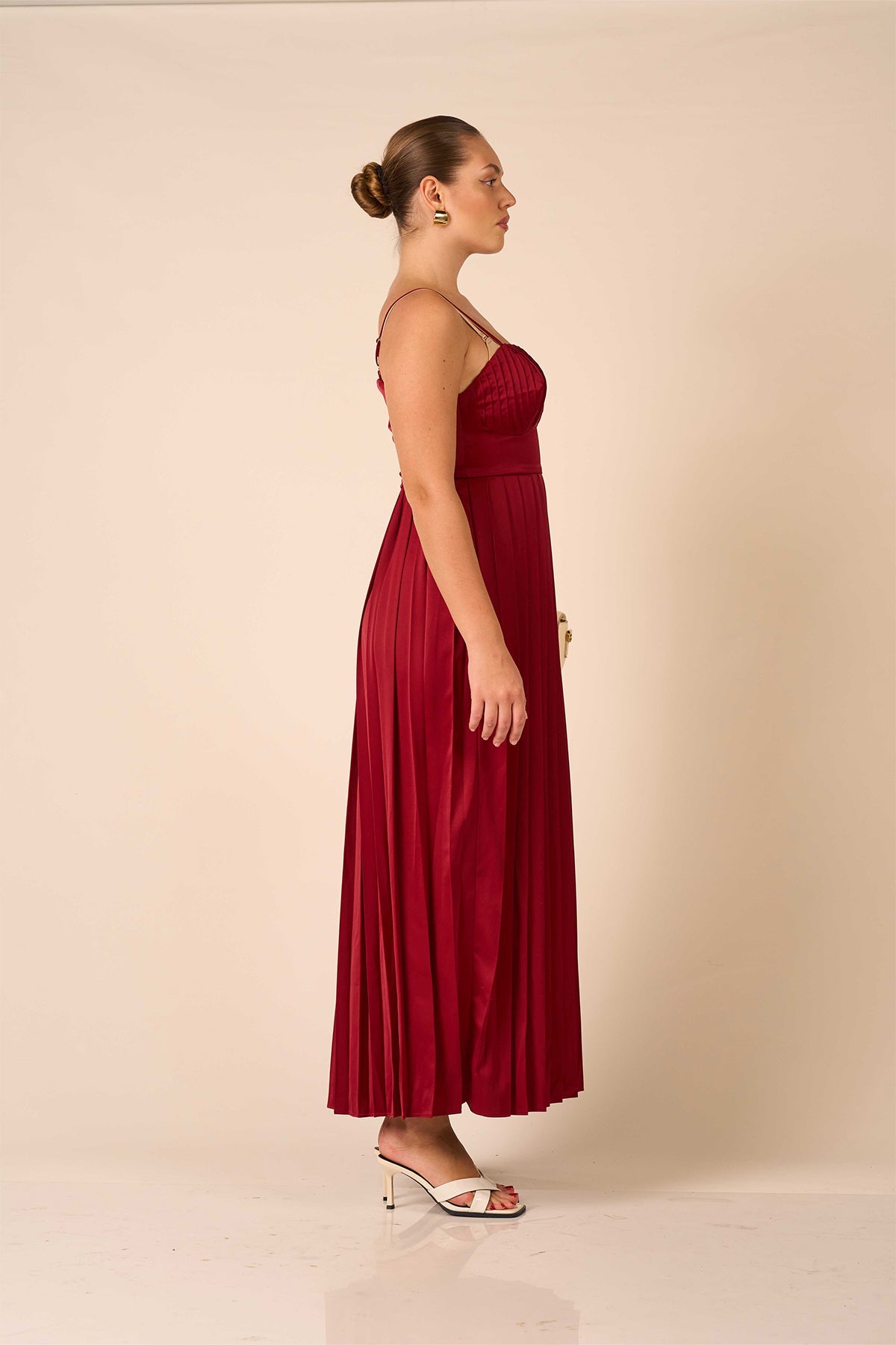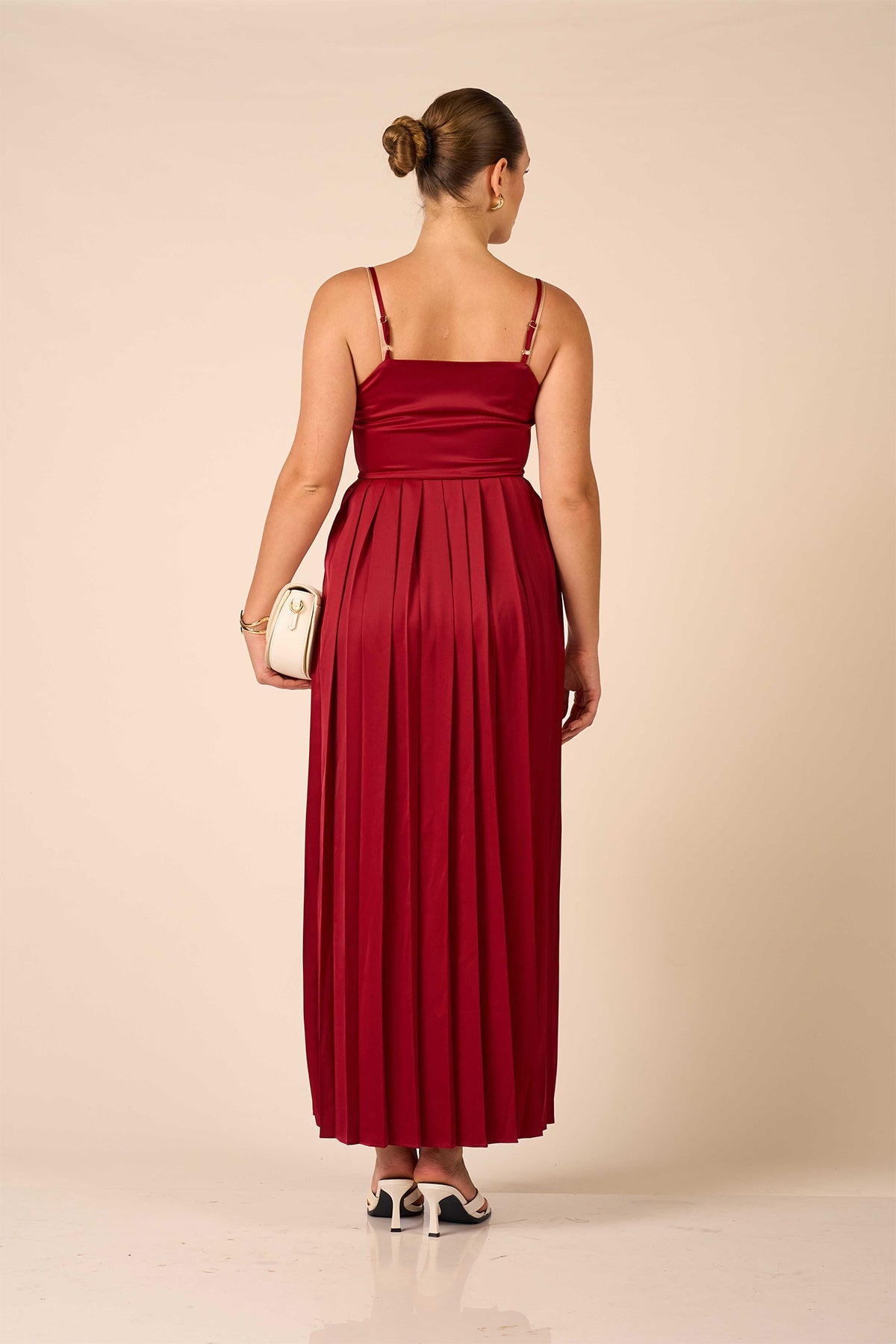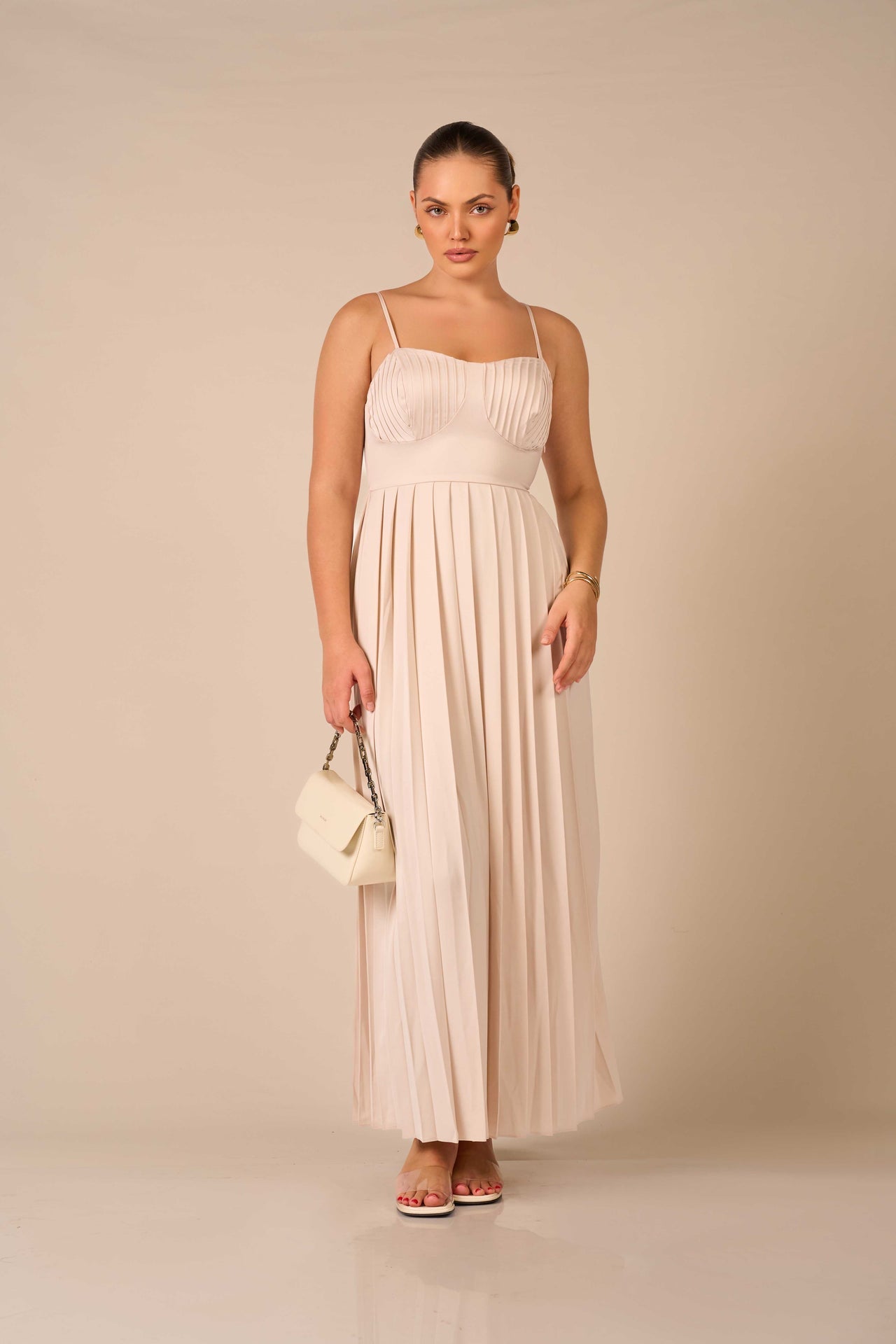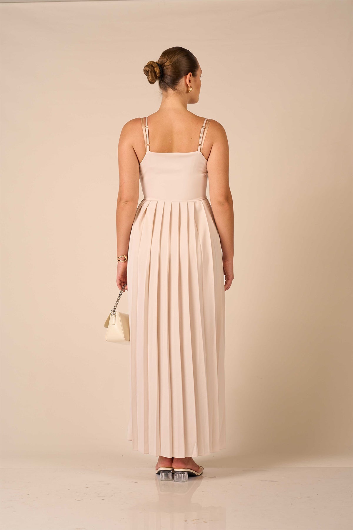 Elegant maxi-length evening dress crafted in luxurious sateen fabric, featuring a strappy pintuck-detail bodice that adds delicate texture and sophistication. The flowing pleated skirt creates graceful movement, making it a perfect choice for formal occasions and refined evening events