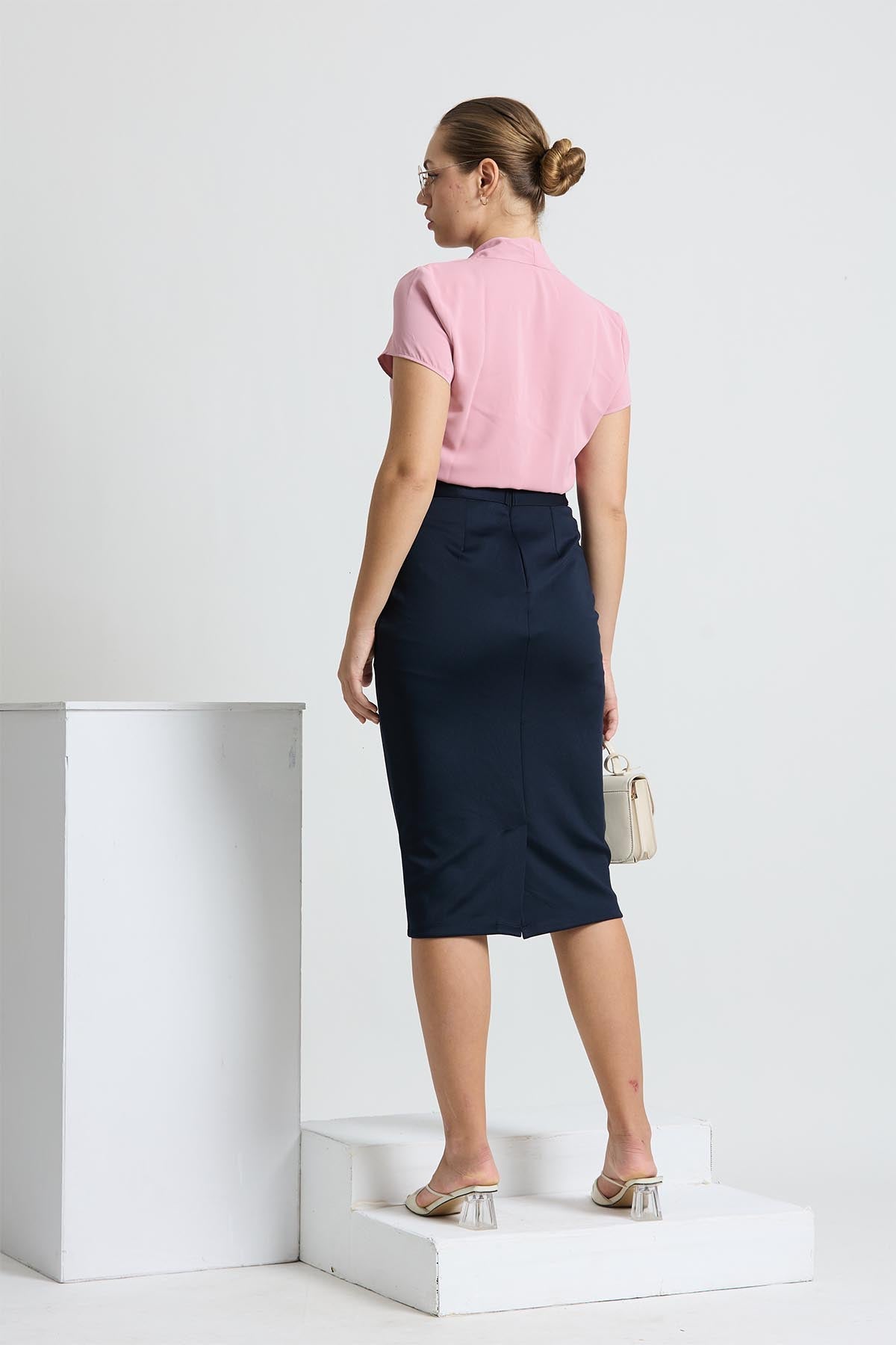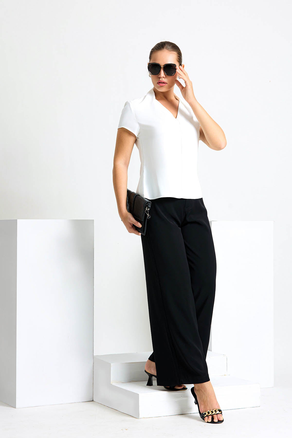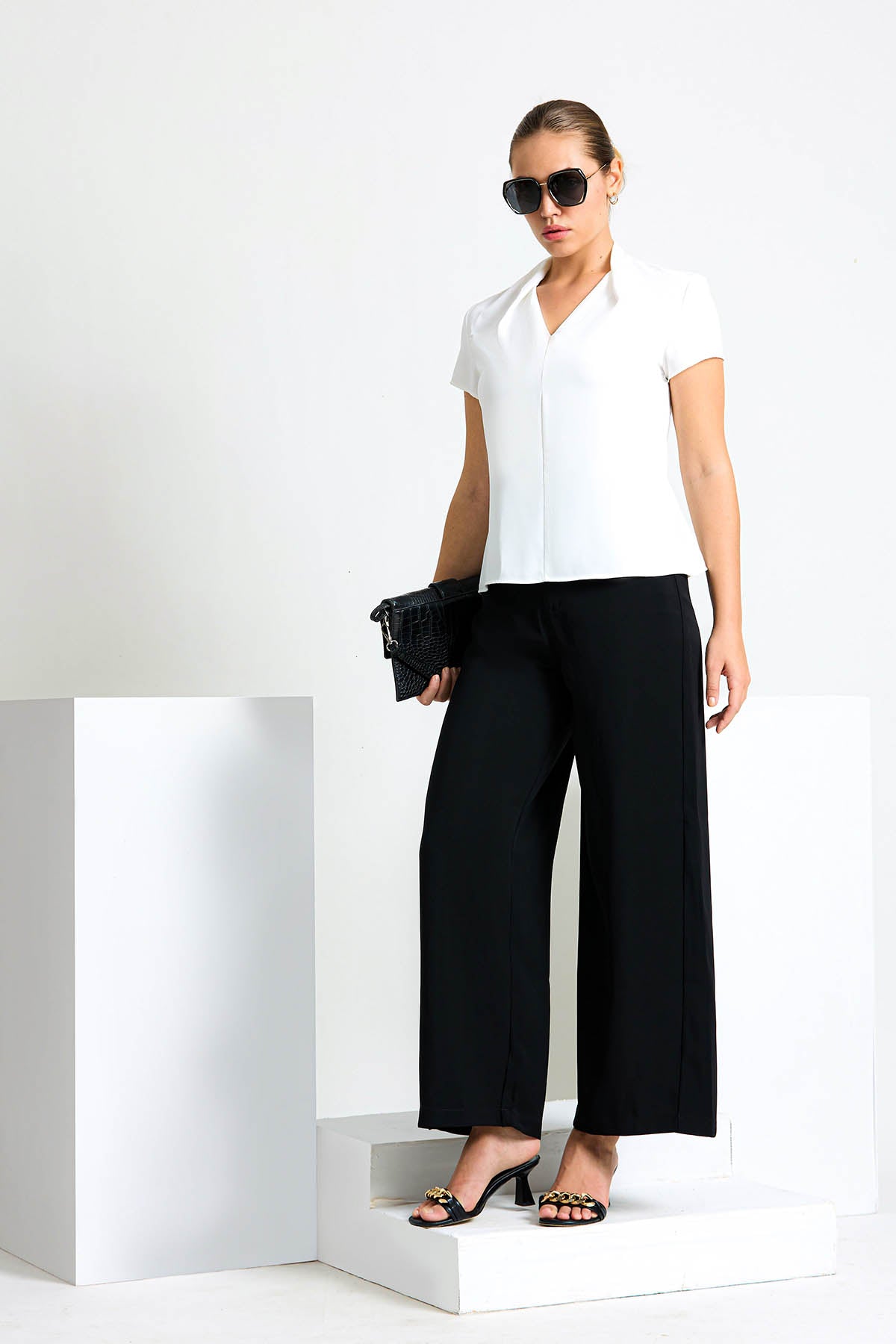 Short sleeve georgette formal top featuring a simple round neckline and clean, elegant detailing. Soft, lightweight fabric drapes beautifully for a polished, professional look. Perfect for office wear or formal occasions.