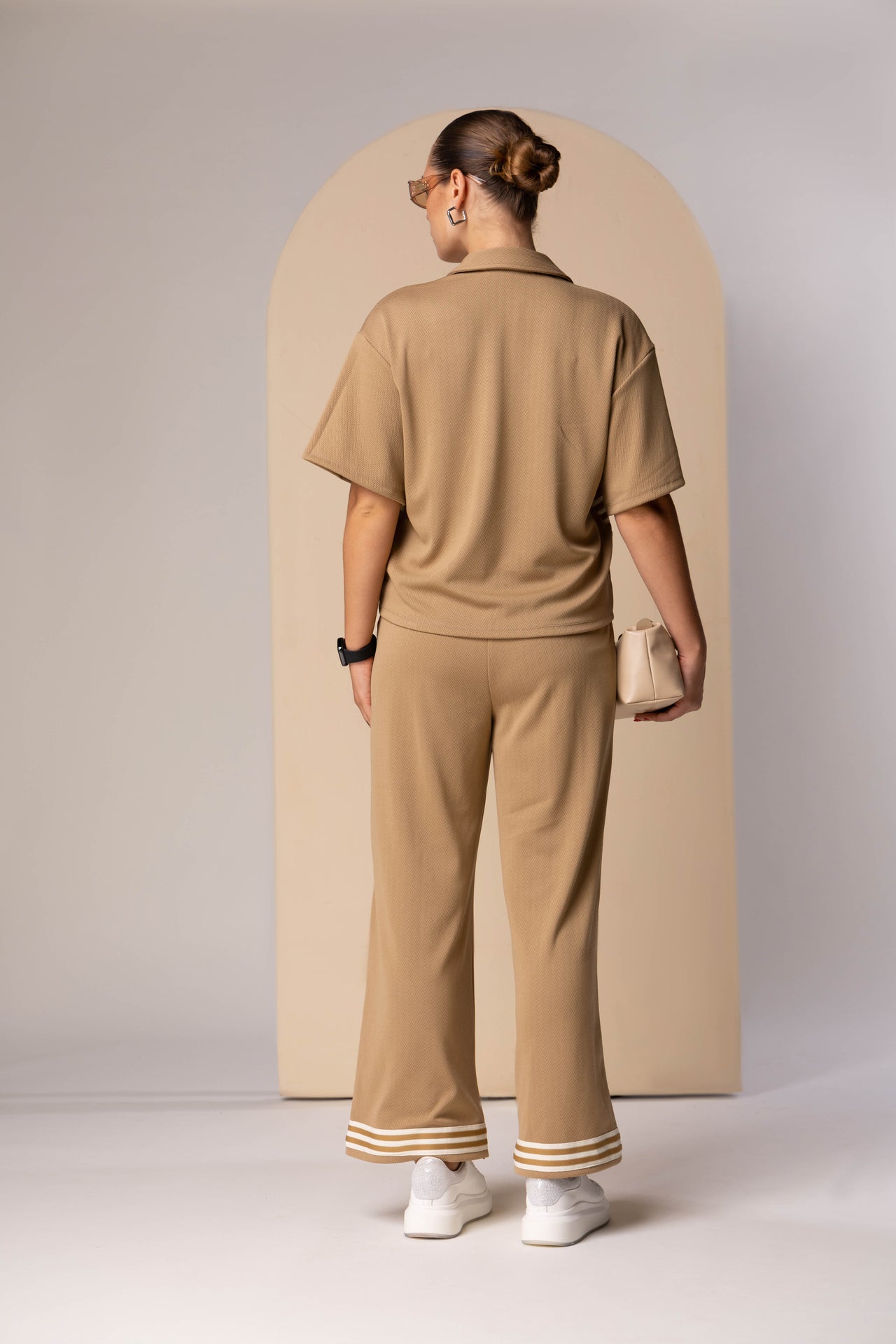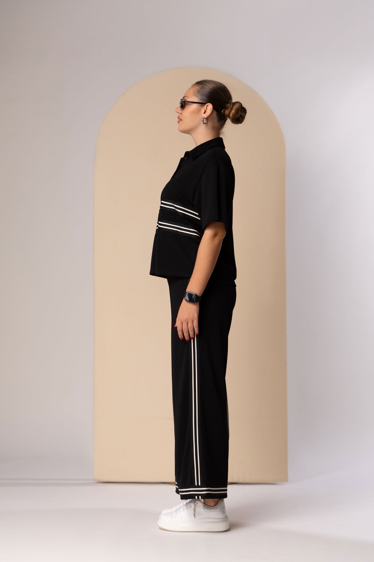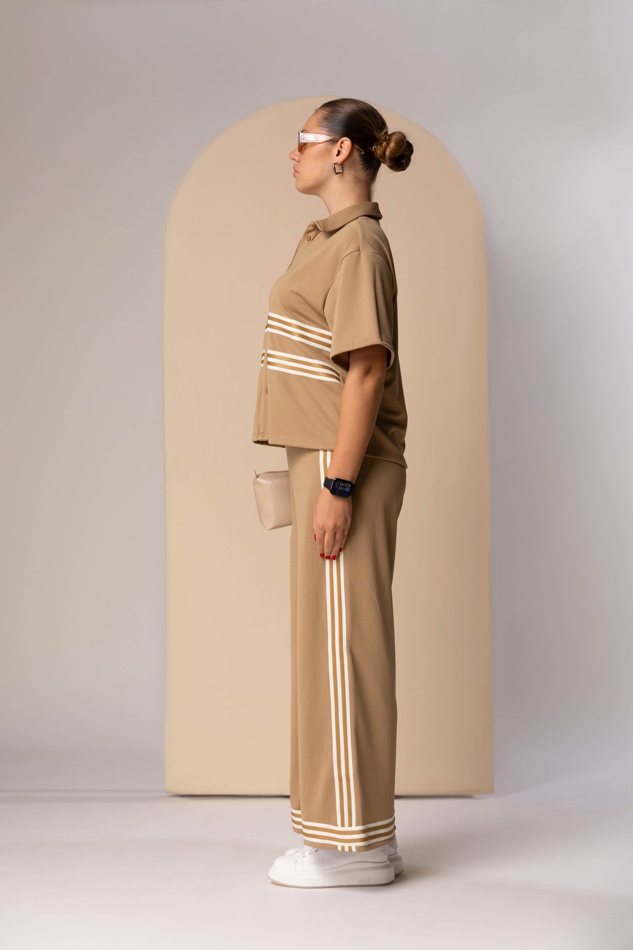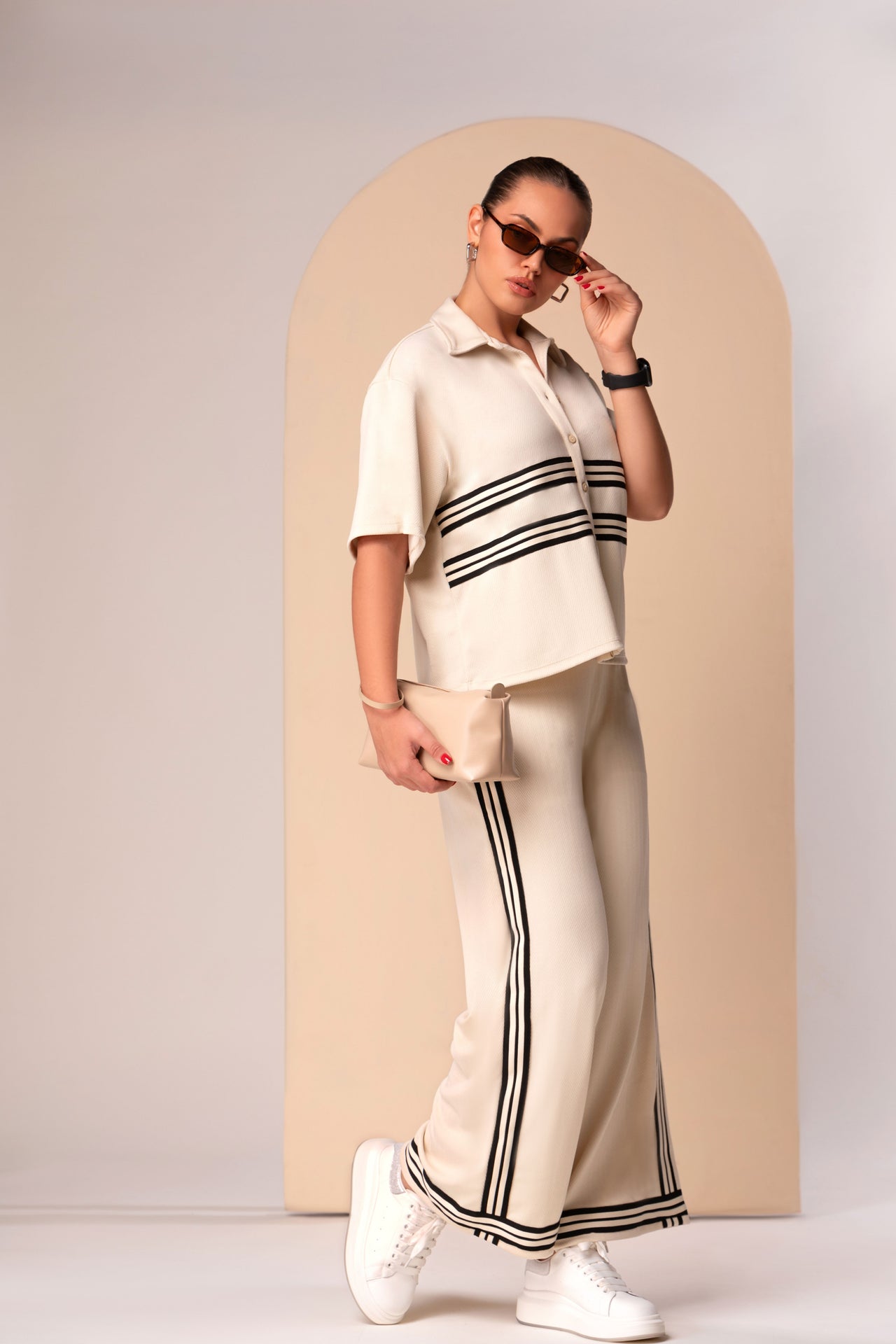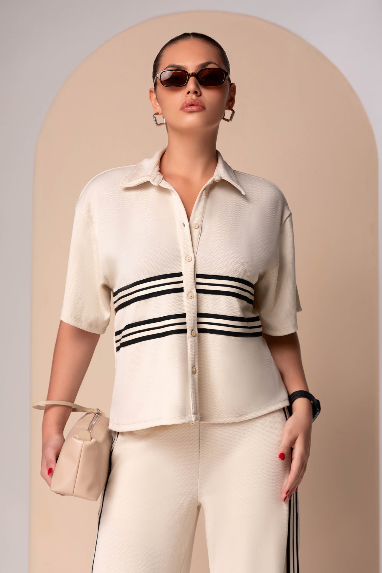 This ensemble defines "Sport-Executive Hybridity," where the structured visual language of corporate suiting is reimagined through the materials and motifs of performance activewear. The look centers on a technical short-sleeve button-down that utilizes a heavy, textured knit fabric reminiscent of high-end athletic gear. This top features prominent horizontal racing stripes across the chest, which serves as a high-energy focal point while referencing classic track-and-field aesthetics.