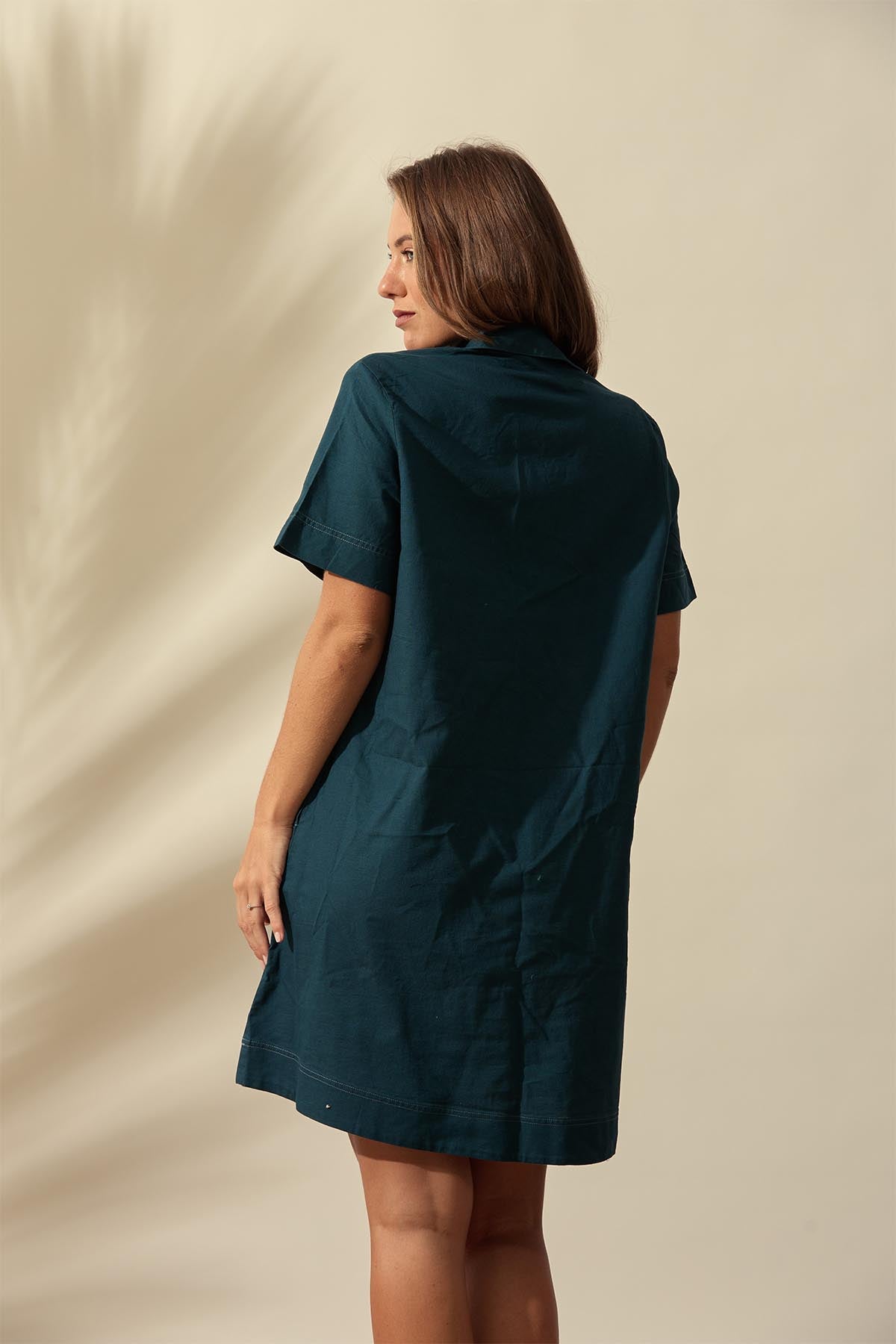 Crafted from breathable linen-cotton fabric, this knee-length dress offers easy comfort in a loose-fitted silhouette. Designed with short sleeves and both side and front patch pockets, it blends functionality with effortless style. Contrast thread detailing adds a subtle yet striking touch, making it a go-to piece for relaxed, everyday wear.