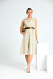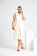 A sleeveless front inverted pleat collar dress is a stylish and feminine outfit featuring a structured collar neckline, no sleeves for a breezy, modern look, and a distinct inverted pleat at the front that adds volume and subtle flair. Ideal for semi-formal occasions, it combines elegance with comfort and clean lines.