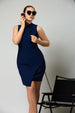 This look is a Modern Power Professional style, featuring a fitted, sleeveless sheath dress with a distinctive mock neck and an asymmetrical tulip-style slit.