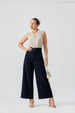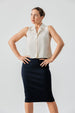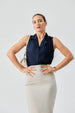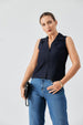 Based on the image, the product is a sleeveless top. It features a neckline with a high collar that folds over, creating a soft V-shape. The fit is relaxed and smooth.