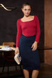This elegant long-sleeve top is designed with a wide square neckline for a modern yet professional look. Made from a soft, subtly textured knit fabric, it offers all-day comfort without sacrificing style. The unique curved hem adds a touch of contemporary polish while remaining appropriate for business environments. Perfectly fitted to layer under blazers or pair with high-waisted skirts and trousers, this top balances feminine sophistication with professional minimalism, ideal for a smart office wardrobe.