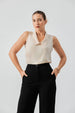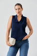 Based on the image, the product is a sleeveless  top. It features a V-neckline with a wide, notched collar similar to a lapel, and a button-down front. The fit appears to be tailored and the fabric is likely a smooth, structured knit or woven material. It's a versatile piece with a sophisticated, minimalist style.