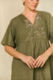 This knee-length dress blends comfort and charm with its breathable linen-cotton fabric and relaxed fit. The elegant V-neckline and elbow-length sleeves offer a timeless silhouette, while the delicate front embroidery adds a handcrafted touch. Designed with convenient side pockets, this piece balances functionality and effortless style — perfect for warm days or casual outings where comfort meets understated sophistication.