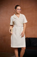 A sleek, minimalistic dress featuring turn-up short sleeves with drop shoulder and an overlapping blazer-style collar. The design includes front flap detailing and an adjustable fabric belt at the waist, creating a sophisticated yet simple silhouette. Perfect for a polished, contemporary look with a touch of elegance.