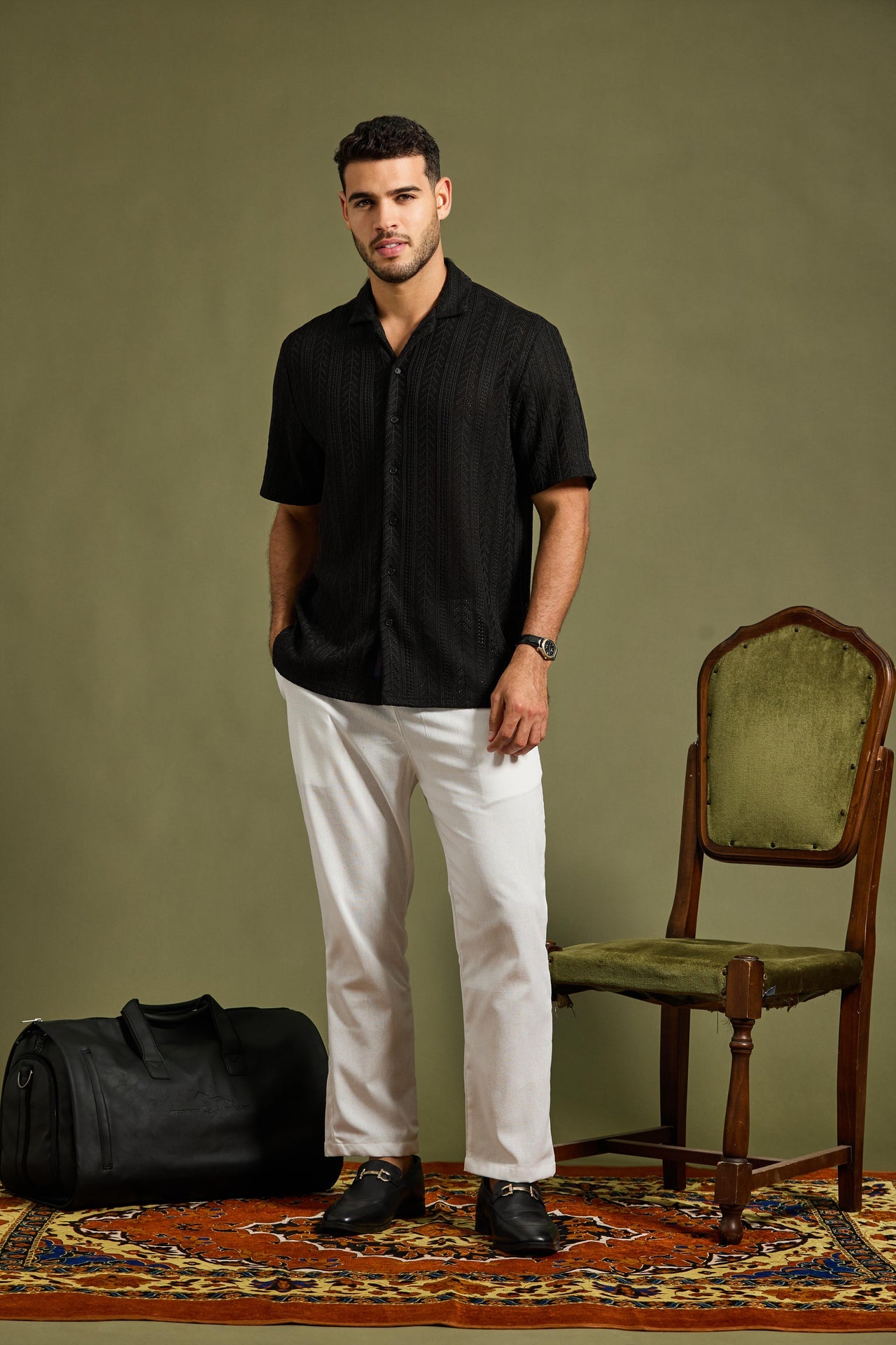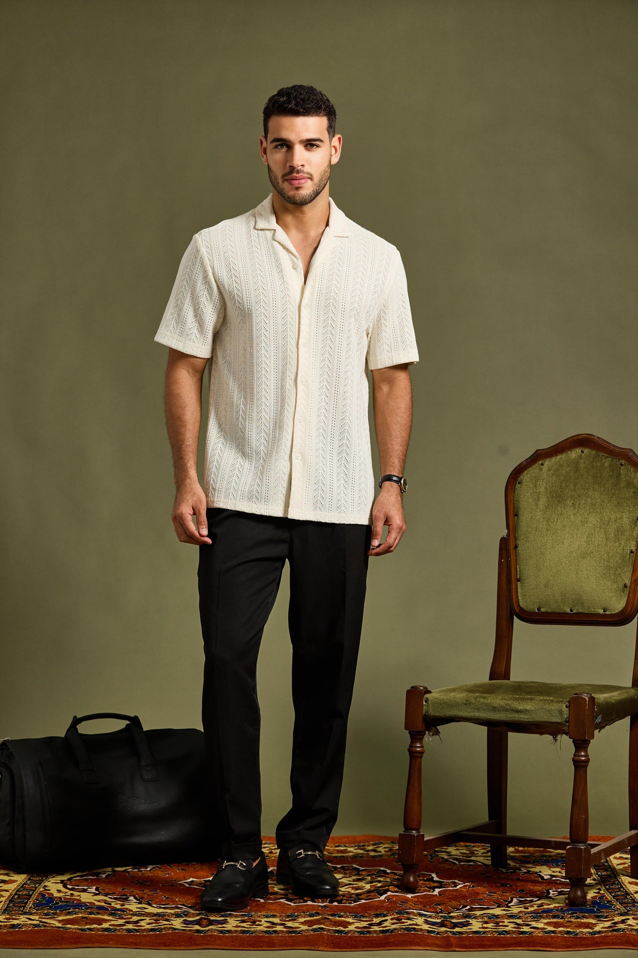 The Elvaro Lace-Knit Resort Shirt is designed to bring effortless sophistication to warm-weather dressing. Crafted from a lightweight, breathable knit, it features an intricate openwork pattern that creates rich texture and natural airflow for all-day comfort. The resort-style open collar adds a relaxed, contemporary edge, while the clean button-through front and tailored short sleeves keep the silhouette sharp and refined. Soft to the touch with a fluid drape, this shirt blends comfort with statement detail—perfect for elevated casual looks that transition seamlessly from daytime outings to evening occasions.