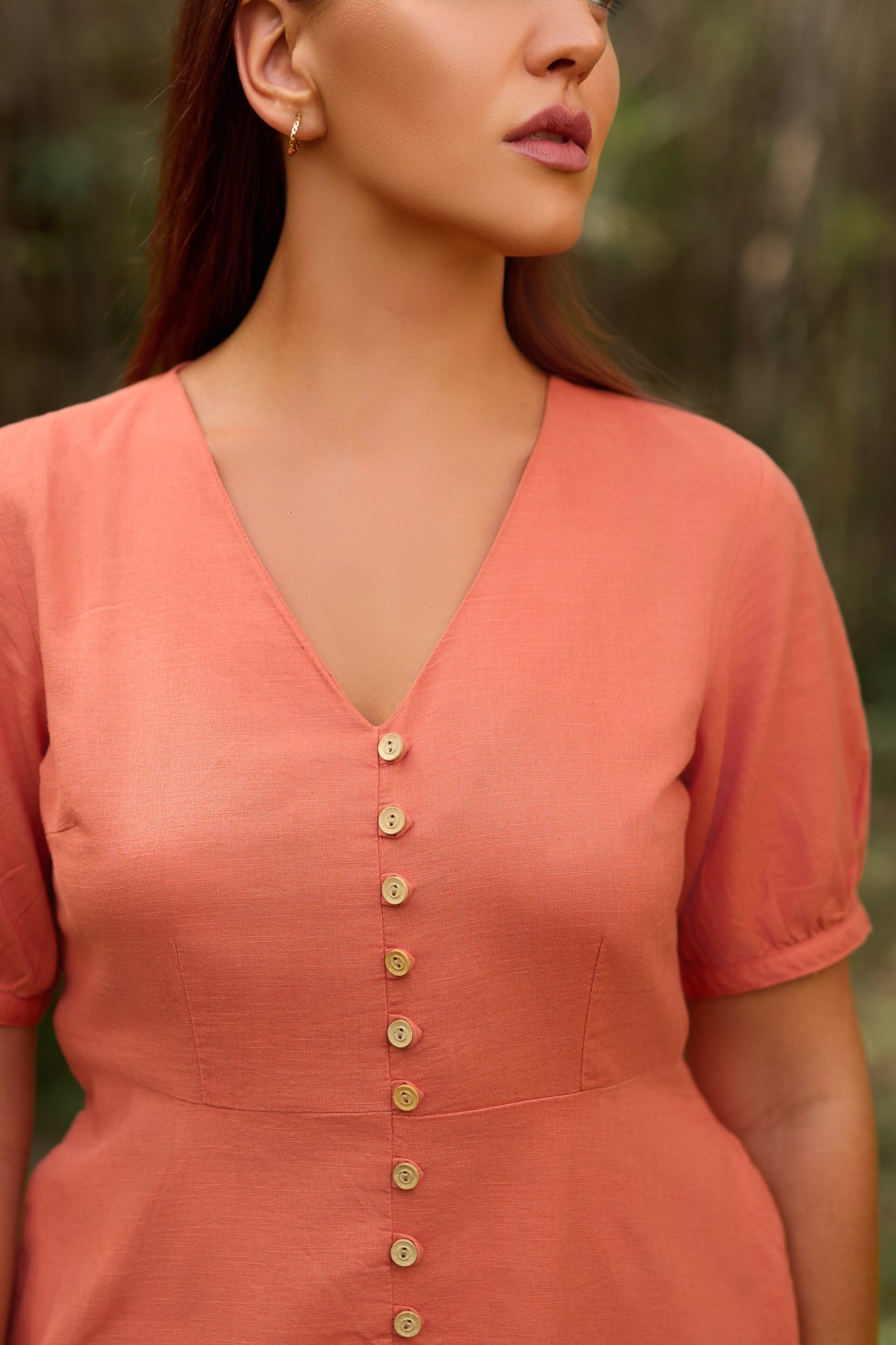This loose-fitted midi dress is crafted from breathable linen-cotton fabric for all-day comfort. Featuring puff sleeves and a relaxed silhouette, it offers effortless, airy style. The front showcases charming wooden button details, adding subtle character, while functional side pockets enhance practicality. Perfect for warm days, casual outings, or laid-back gatherings, this versatile dress blends timeless elegance with relaxed comfort for a wardrobe essential you’ll reach for again and again.