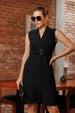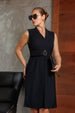This sleek, sleeveless dress features a structured V-neckline and a clean, tailored silhouette. A standout detail is the belted waist, accentuated with a distinctive gold abstract buckle that adds a touch of modern elegance. The dress falls just below the knee with a subtle front slit for ease of movement and added sophistication. Designed with minimalist lines and refined finishing, this piece offers a versatile option for both professional and evening wear.