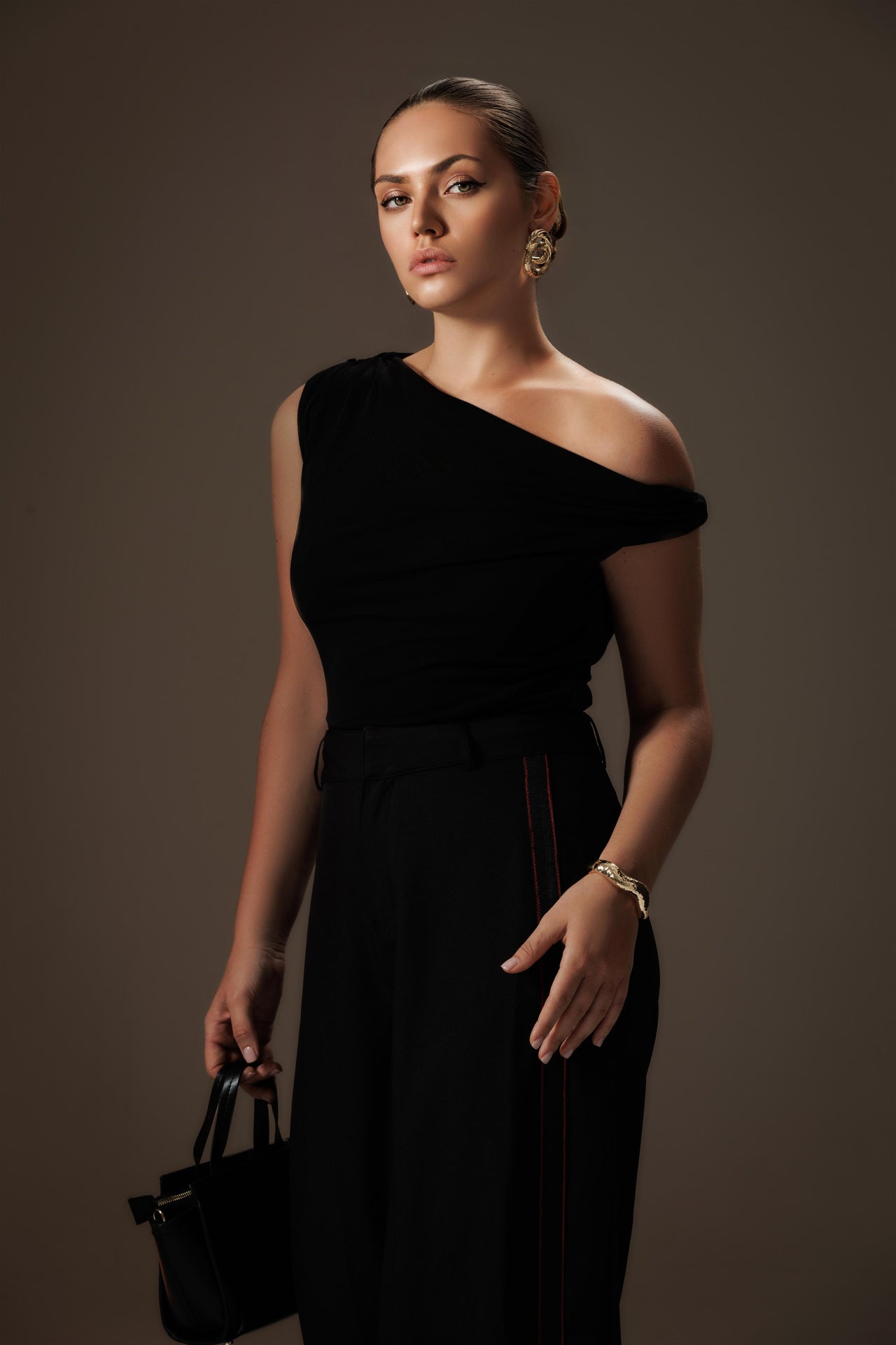 A supremely versatile and elegant top designed to elevate any executive ensemble. This shell top features a striking asymmetric draped neckline that offers a subtle yet sophisticated statement. The refined, sleeveless design and smooth fit make it perfect for layering under blazers or wearing alone. Crafted from a luxurious material blend that maintains its shape and exquisite drape. An essential foundation piece that brings artistic texture to professional wear.