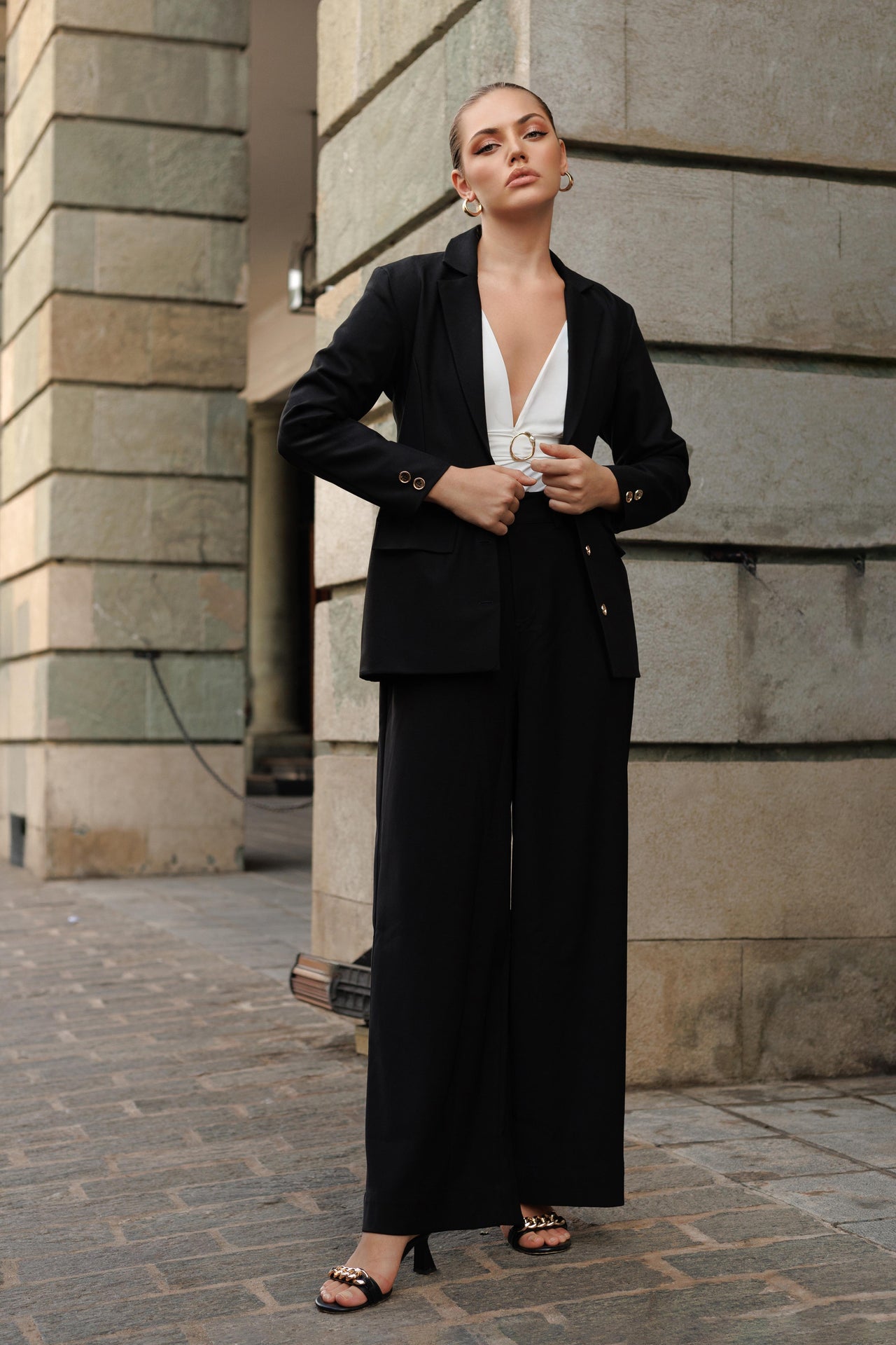 This is a chic, form-fitting bodysuit designed to create a sleek and modern silhouette. It features a deep V-neckline with soft gathers that enhance the bust and a metallic ring detail at the waist, adding a touch of elegance. The sleeveless cut and smooth, stretch fabric ensure a comfortable yet sculpted fit, perfect for layering under tailored jackets or pairing with high-waisted trousers. This piece blends sophistication with versatility, making it ideal for both polished workwear and refined evening looks