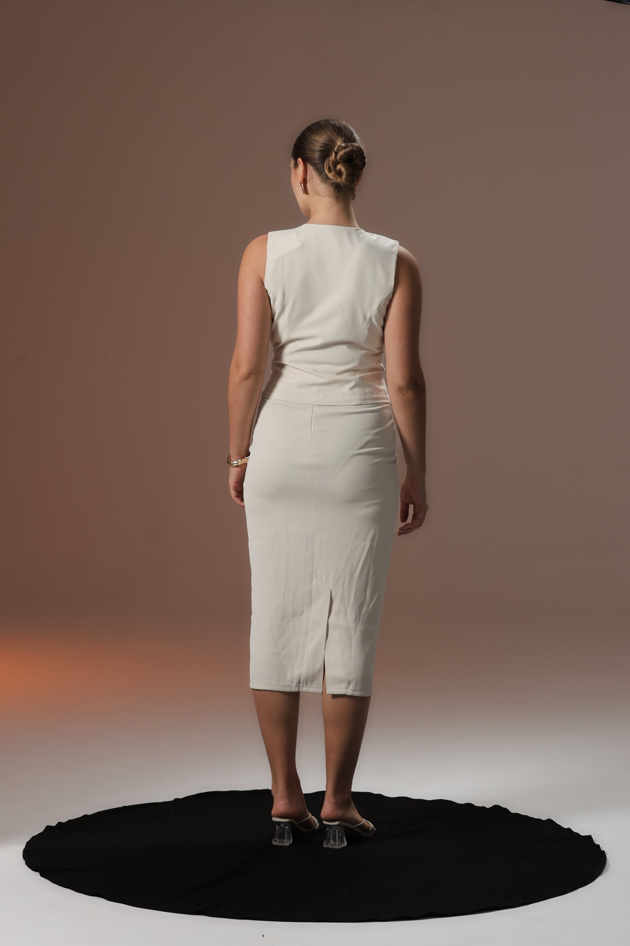 A modern, powerful alternative to the traditional blouse or blazer. This fitted black waistcoat features a crisp V-neckline and a structured, sleeveless silhouette. The waist is the focus, defined by bold, functional double leather buckle straps that cinch the form for an authoritative shape. Crafted from structured suiting fabric, this piece is ideal for layering or wearing solo. It delivers an instant injection of structure and contemporary power to any CEO ensemble.