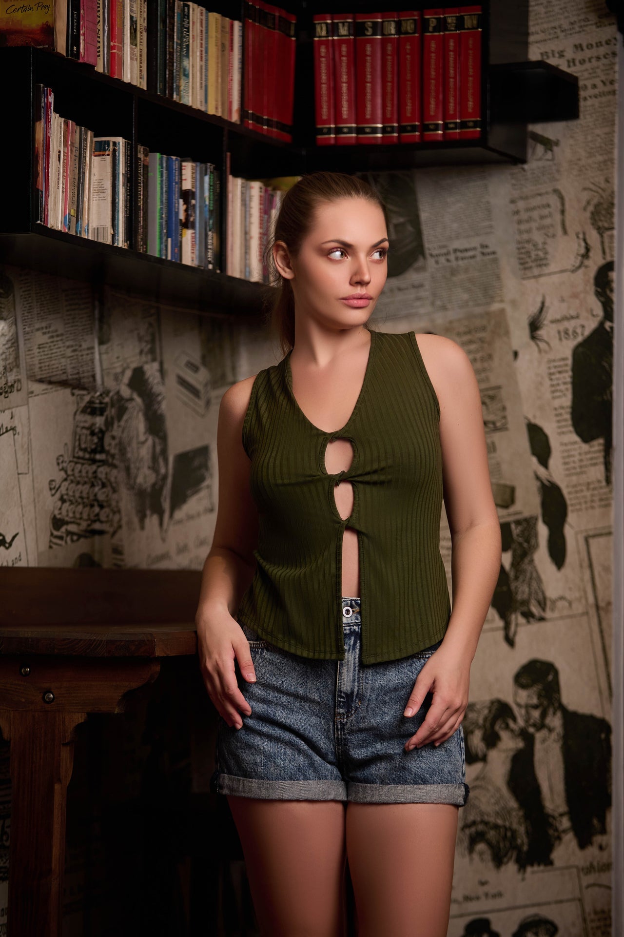 An elevated basic crafted from a comfortable, vertical-ribbed knit, distinguished by its playful yet sophisticated design featuring a deep, plunging V-neckline separated by a central keyhole cutout secured with a subtle twisted detail, which elegantly parts to create a front split that adds a modern edge to the bodice. For versatile styling, pairing will help to create an elegant evening vibe or a chic daytime mood.