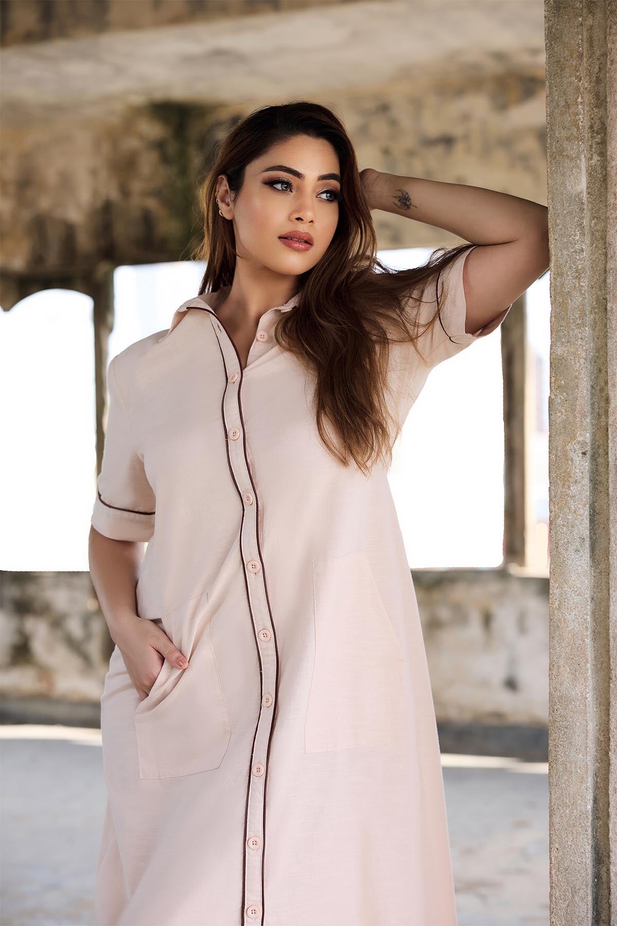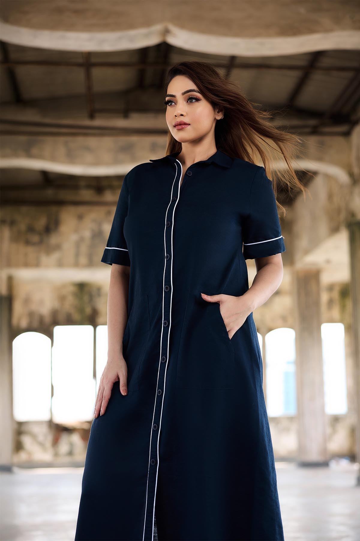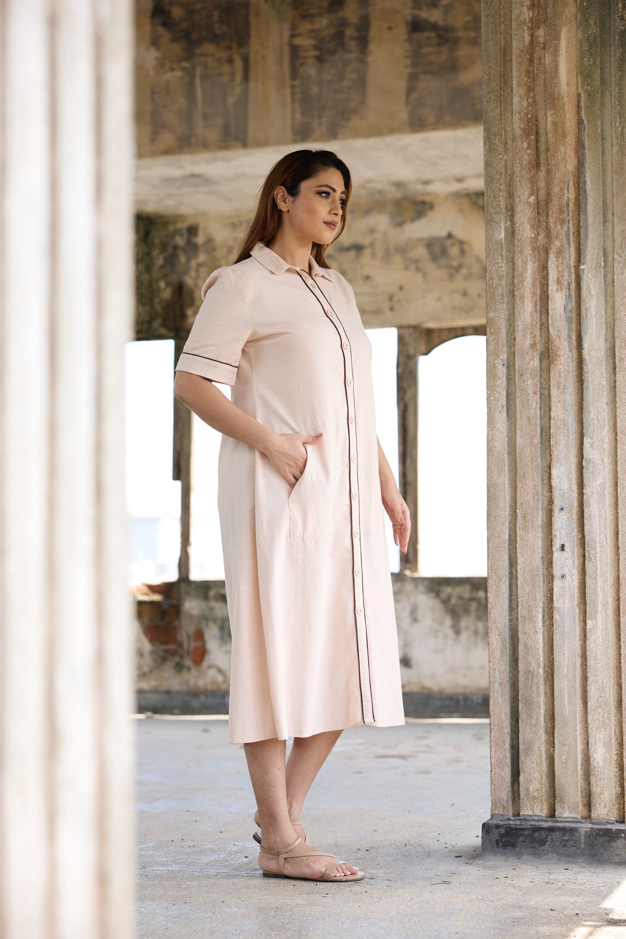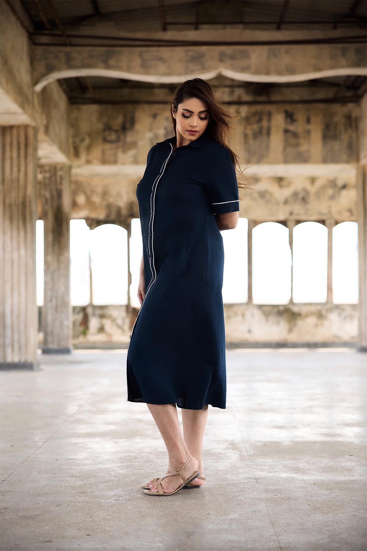Effortlessly stylish and easy to wear, this short-sleeve midi dress is crafted from breathable linen-cotton fabric to keep you cool and comfortable all day. The contrast detailing adds a modern touch, while the button-down front and functional pocket accents bring both charm and practicality. Designed for relaxed days and casual elegance, this dress is a versatile piece you'll reach for again and again.