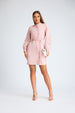 This captivating casual short dress in a delightful shade of salmon pink or coral exudes an effortless blend of comfort and style. The design takes cues from a classic shirt dress, featuring a sophisticated mandarin collar that lends a polished touch. Its full button-down front allows for versatile styling, whether worn fully closed for a more demure look or slightly unbuttoned for a relaxed vibe.