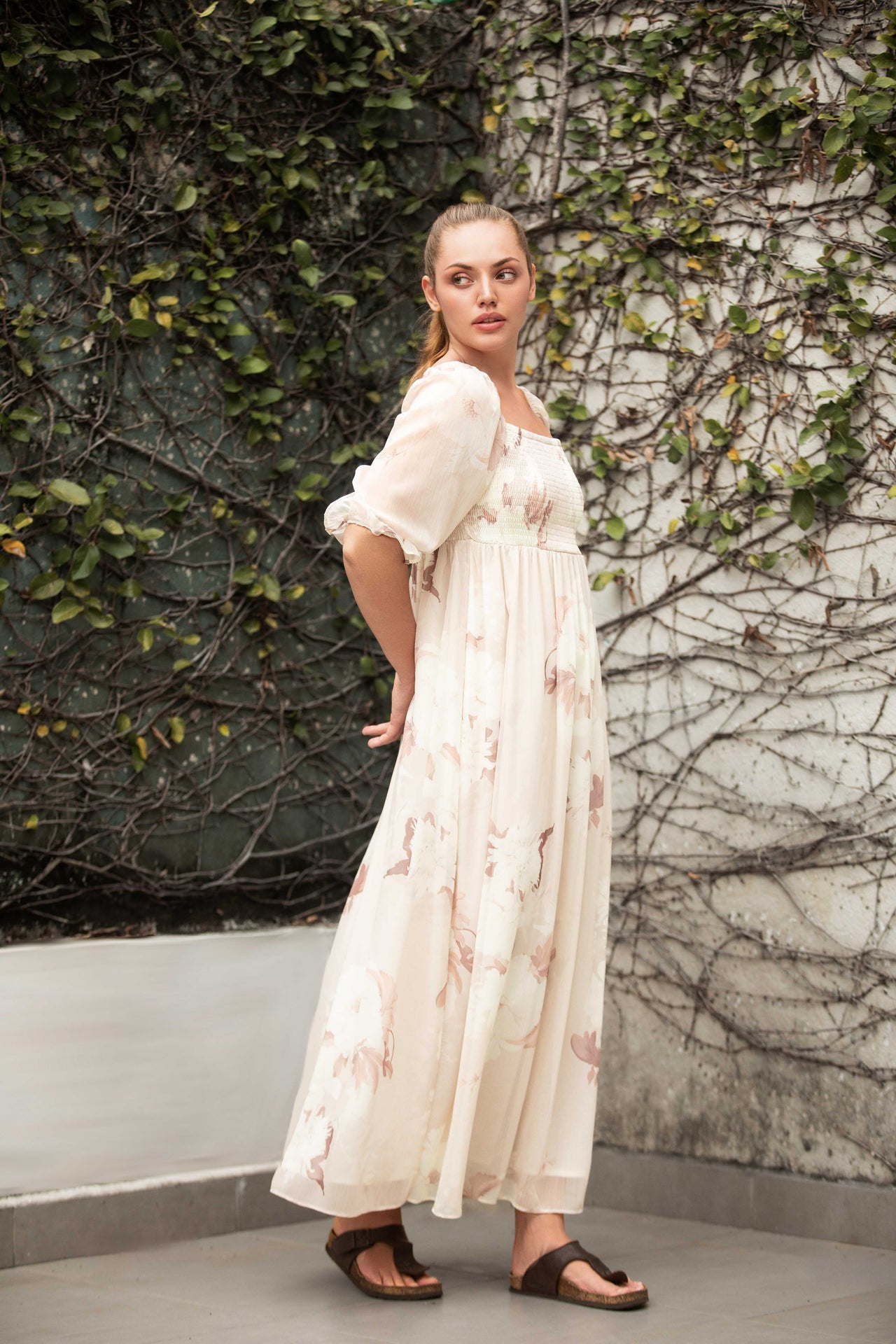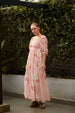 This elegant garment is a maxi-length dress featuring a delicate, flowing silhouette. The color is a soft blush or pale peach base overlaid with an abstract floral print in muted tones.The material is lightweight and sheer, suggesting a delicate outer layer over a solid inner lining, which gives the dress an ethereal quality and great movement.