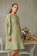 Crafted from breathable linen-cotton fabric, this knee-length dress combines comfort with feminine charm. Featuring a relaxed, loose-fitted silhouette, it showcases delicate embroidery on the long sleeves and a flattering curved neckline. The playful bottom frill adds gentle movement, while functional side pockets enhance practicality. Perfect for warm days, casual outings, or relaxed gatherings, this versatile dress blends effortless style with everyday comfort, making it a timeless wardrobe essential.