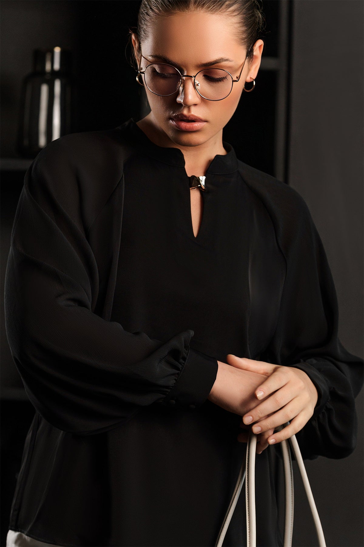 This elegant black blouse is a versatile wardrobe essential, balancing a relaxed fit with refined details. Crafted from a soft, flowing fabric, it features a sophisticated stand collar and a distinctive keyhole cutout at the base of the neck, adding a subtle element of intrigue. The blouse is designed with raglan sleeves that flow into gentle elasticated or smocked cuffs, creating a soft puff effect and ensuring comfortable wear. Its versatile black color and clean design make it perfect for pairing with anything from tailored trousers to casual shorts.