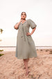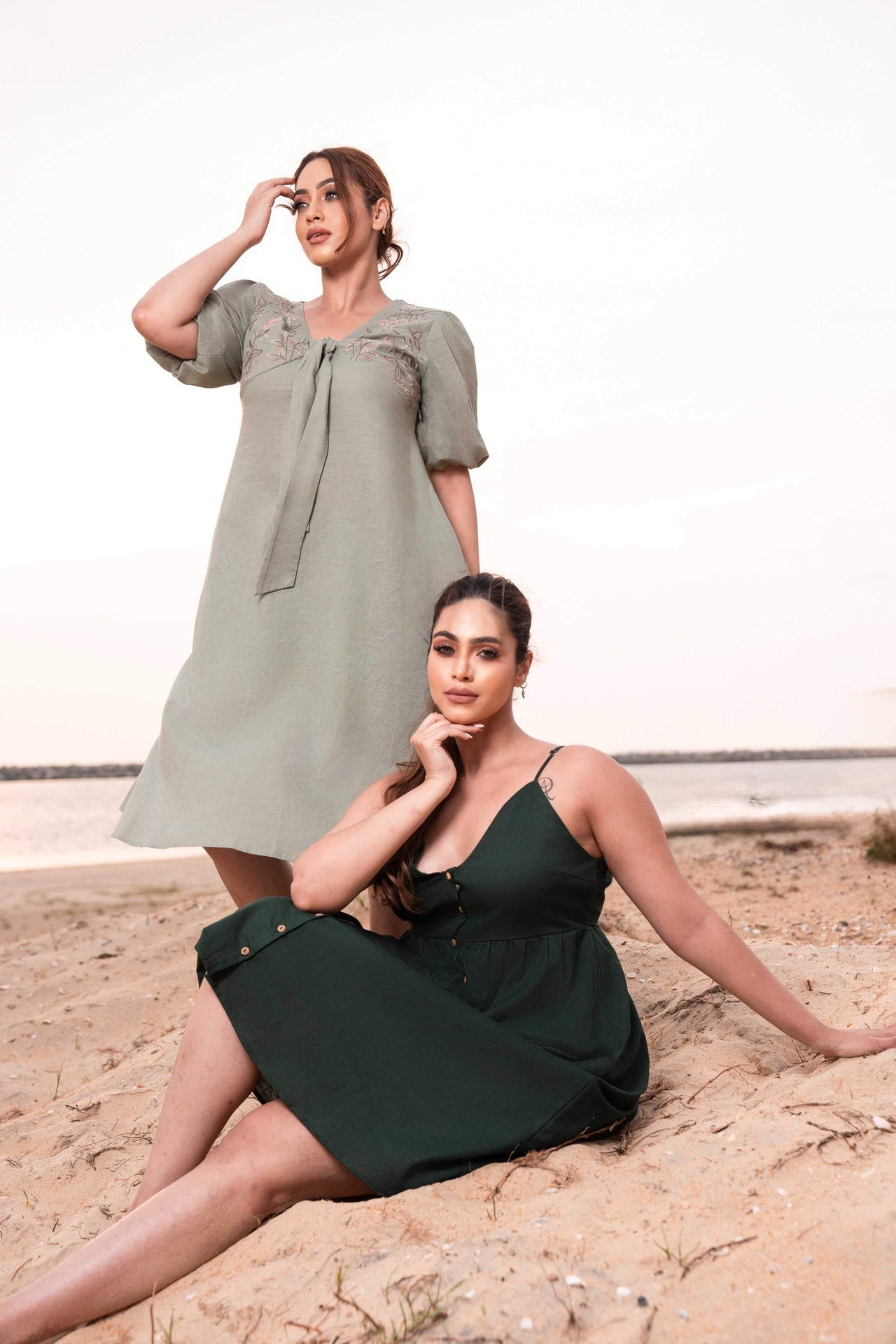 Delicate and graceful, this linen-cotton midi dress features puffed elbow-length sleeves and a charming front tie detail that adds a feminine touch. Floral embroidery brings subtle elegance, while side pockets offer everyday practicality. Made from breathable, lightweight fabric, it’s designed to keep you cool and comfortable while looking effortlessly beautiful—perfect for sunlit strolls or relaxed afternoons.