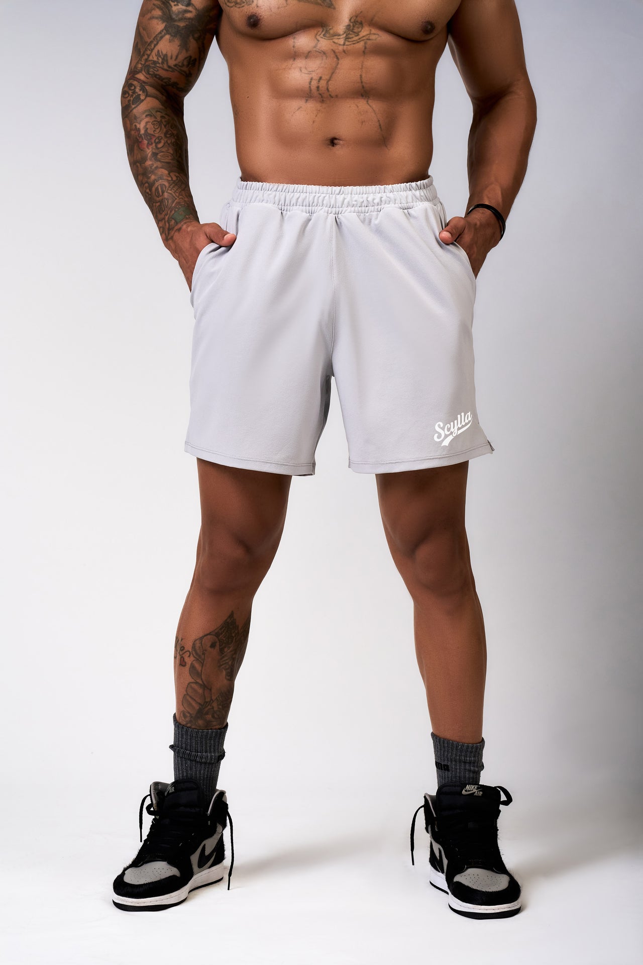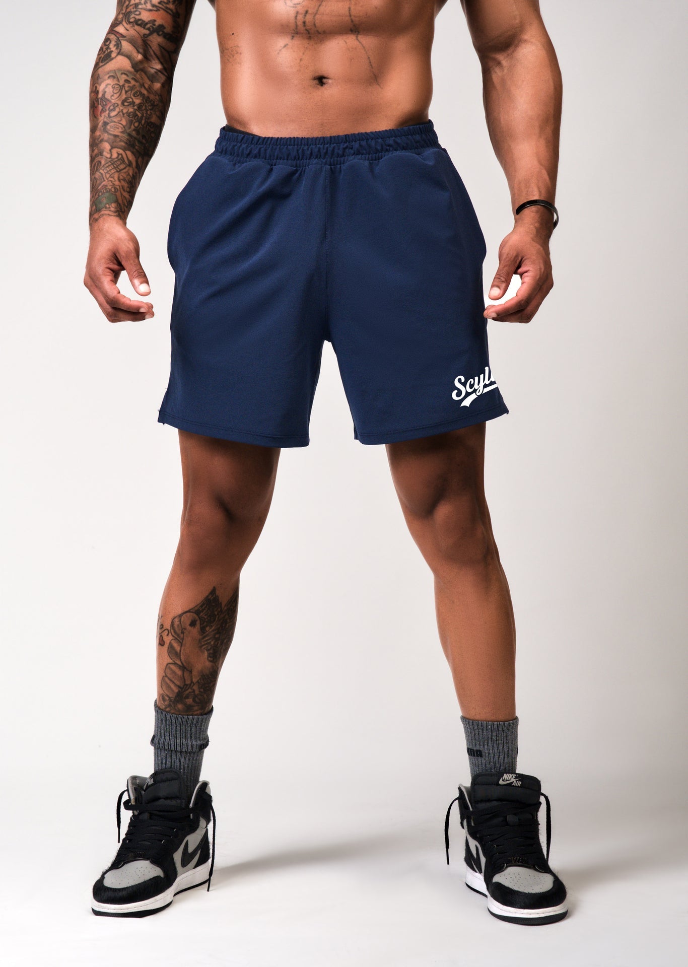 - Short features a side overlap slit, inner drawcord, and a minimal front-left print.