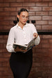 A sleek elbow-length sleeve formal top featuring a solid color design and a hidden placket for a clean, sophisticated finish. Perfect for professional settings, it blends minimal elegance with everyday comfort.”