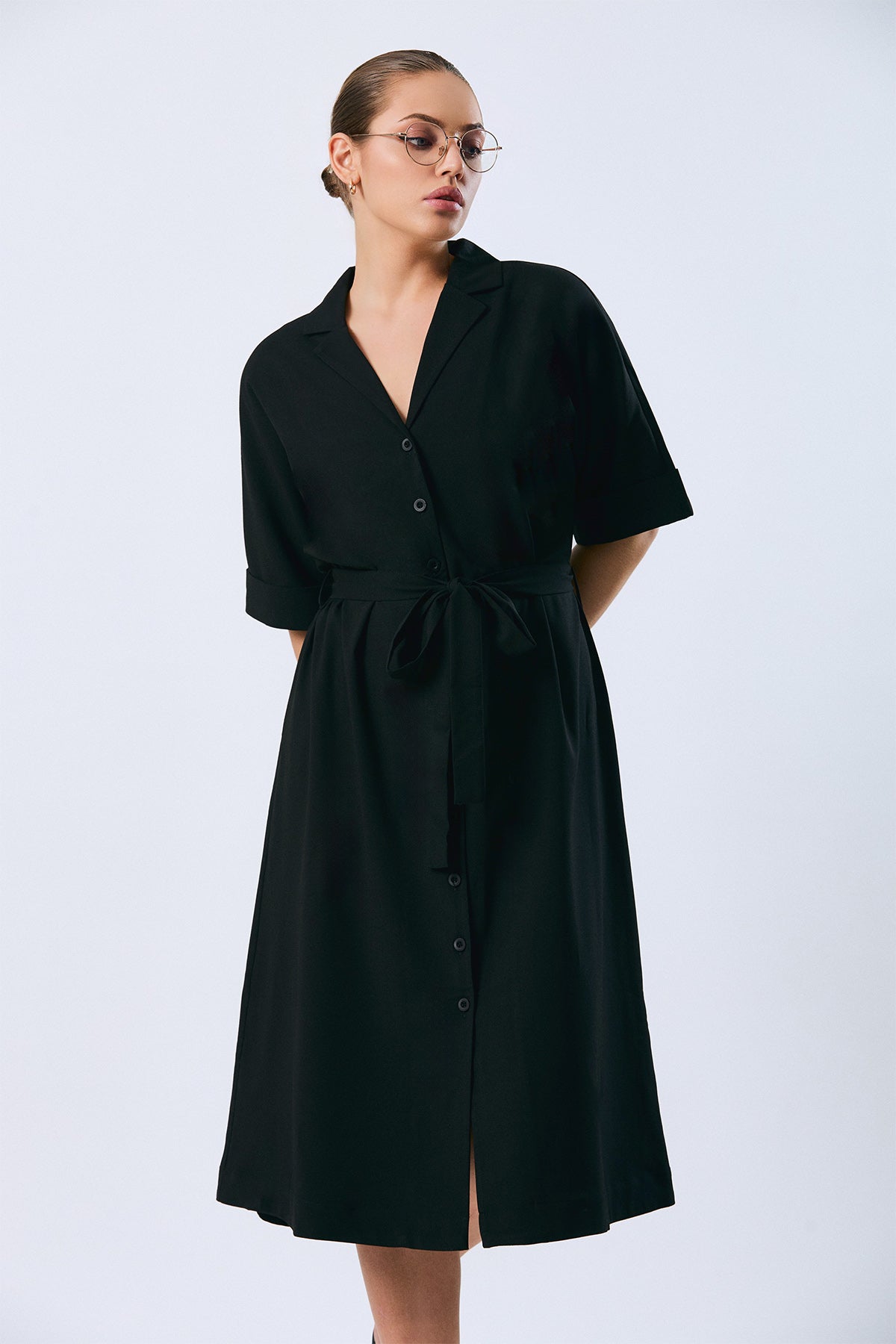 The model is wearing a midi dress. It has a classic collared neckline, short, cuffed sleeves, and a full button-down front. The dress is cinched at the waist with a matching fabric tie belt. She is carrying a small shoulder bag with a two-toned design, featuring shades of brown and tan. The look is simple, elegant, and versatile.