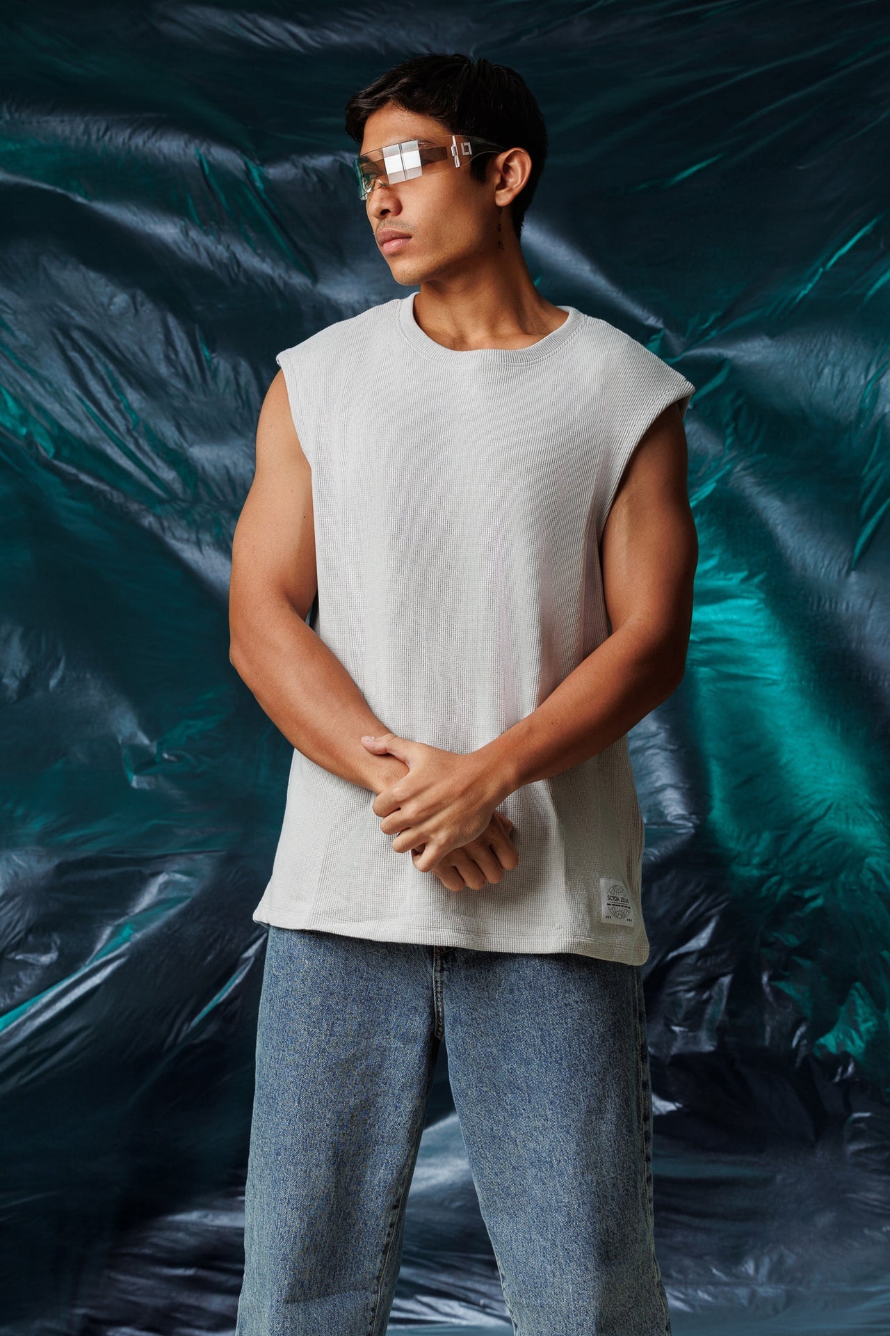 A sleeveless essential designed for ease and structure. Made from ultra-soft rib fabric, this tank features deep arm cuts and a relaxed fit that drapes effortlessly. The rib texture adds subtle dimension, while the clean neckline and raw energy keep it minimal yet elevated.