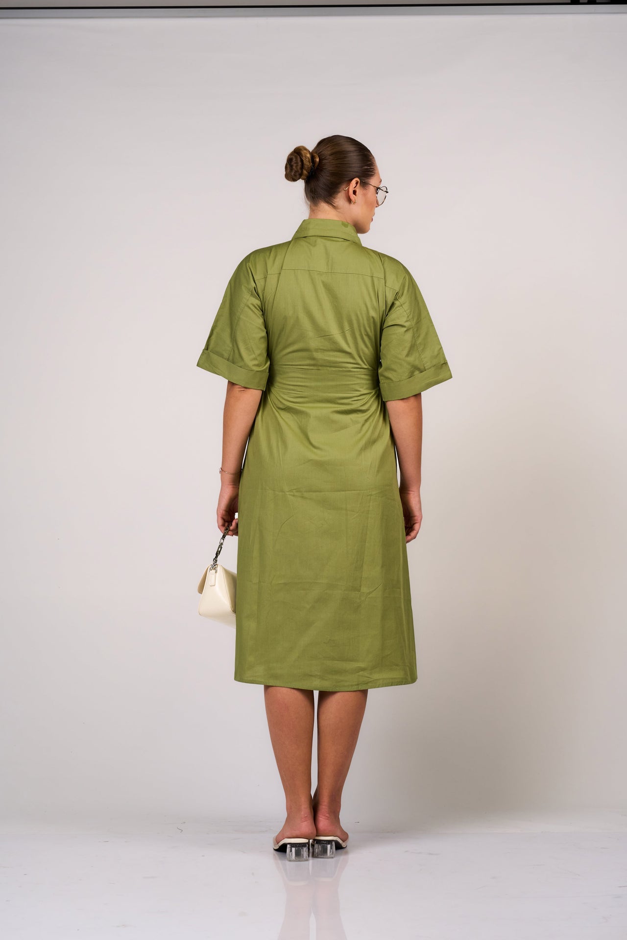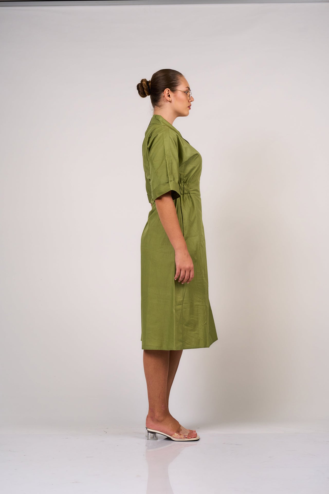 Make a bold professional statement in this wrap midi dress, designed for the woman who values both functionality and high-impact style. This piece features a sophisticated notched lapel collar and short, cuffed sleeves that echo traditional tailoring. The adjustable wrap-around closure is secured by a side-cinching detail, creating a flattering, customized fit that defines the waistline. Crafted in a vibrant yet earthy olive tone, this dress blends an architectural silhouette with casual ease, making it an ideal choice for creative offices or dynamic workday environments
