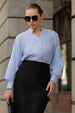 This elegant top blends classic refinement with a modern touch. It features a narrow V-split neckline that flows into a button-down front, offering a clean and structured look. The full sleeves are gathered at the cuffs for soft volume, balancing professionalism with ease. Crafted from a lightweight, breathable fabric, it drapes gracefully while maintaining a refined silhouette, ideal for polished office wear or effortless everyday sophistication.