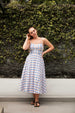 This dress is a charming midi-length summer dress featuring a vibrant check pattern. The color palette is composed of crisp white, deep navy blue, and a soft, rusty orange or tan in a traditional checked design. The material feels lightweight and crisp, suggesting a breathable woven blend that holds the shape of the skirt while remaining comfortable for warm weather.