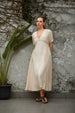 This dress is a structured, Long-length dress rendered in a solid, sophisticated color.The material is firm and smooth, suggesting a sturdy woven material with enough body to hold the tailored silhouette. The hem is detailed with delicate, cascading ruffles in a matching color, embellished with intricate cutwork that adds a charming, vintage-inspired finish.