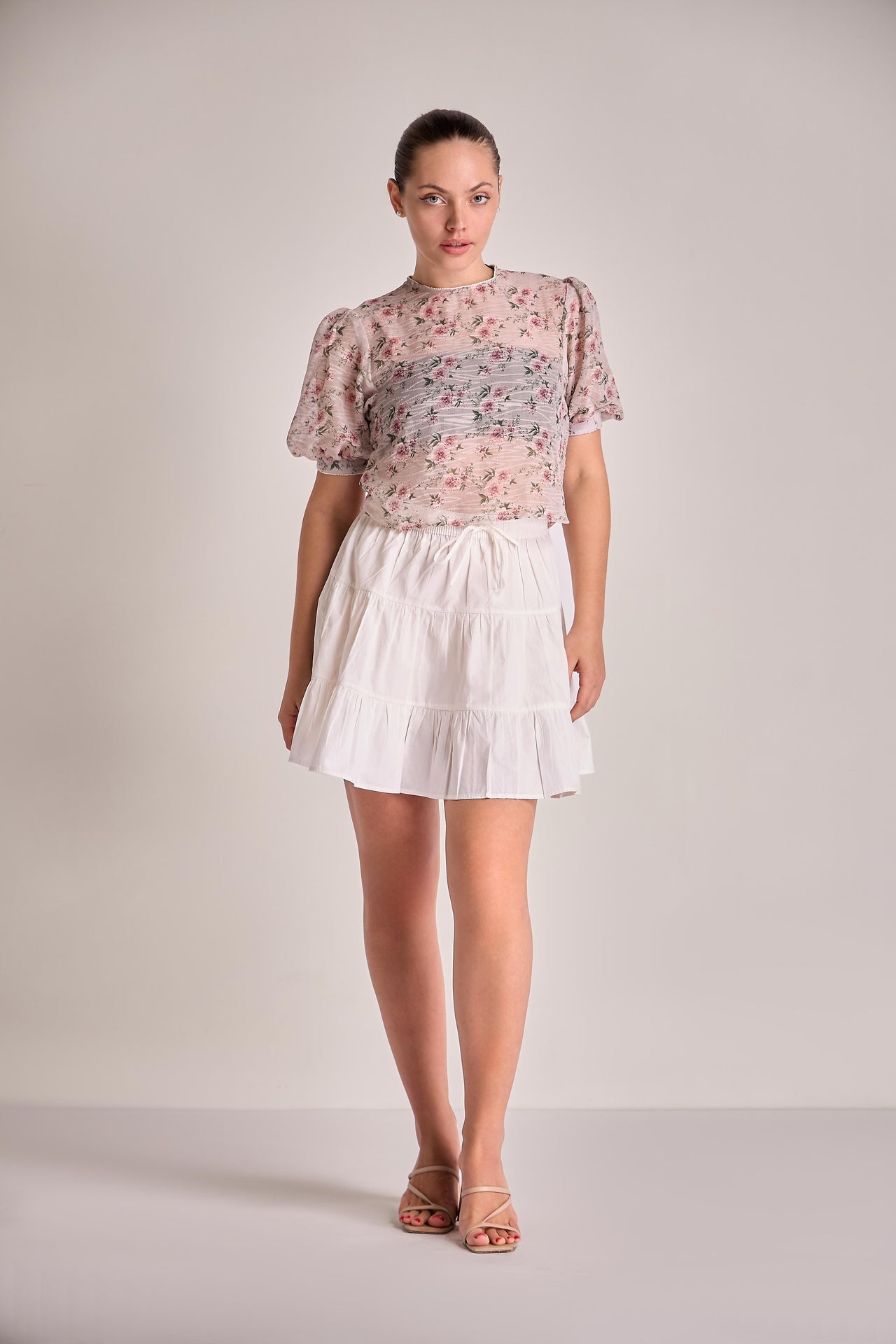 Blouse is an elegant, high-neck top featuring short puff sleeves that add a touch of vintage-inspired volume to the silhouette. The piece is defined by a subtle, wavy pleated texture throughout the material and is adorned with a delicate, all-over floral pattern. Crafted from a lightweight, sheer fabric with a soft drape, this top offers a refined and airy feel, making it a perfect match for both casual and dressier ensembles