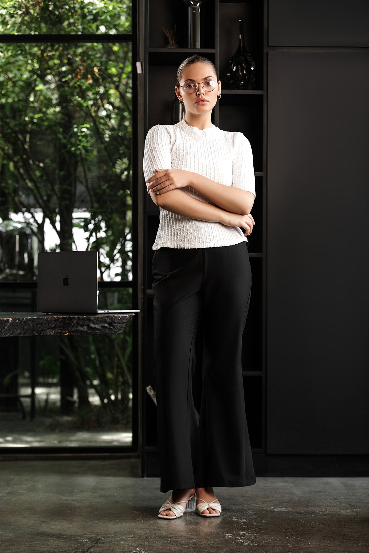 Embrace a bold and elegant silhouette with these striking flared trousers. Designed with a sophisticated high waist, they provide a flattering fit through the hips and thighs before dramatically widening into a full bell-bottom leg. The crisp white fabric and clean tailoring make them versatile for both professional and upscale casual settings. The structured waist ensures a smooth line when paired with fitted or cropped tops, perfectly completing a sharp, modern ensemble.