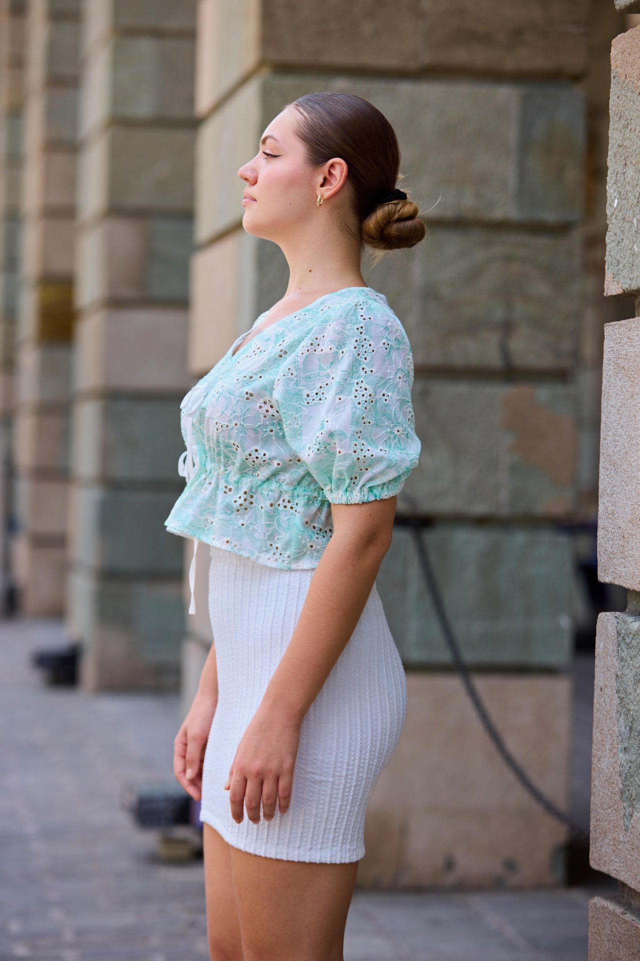 This romantic short-sleeved crop top is defined by its intricate, all-over floral eyelet embroidery and airy texture. It features a flattering V-neckline with a dainty front-tie closure and feminine puff sleeves. The elasticized waist creates a soft, ruffled hemline, offering a whimsical yet structured silhouette that is perfect for pairing with high-waisted skirts or trousers during sun-drenched afternoons.