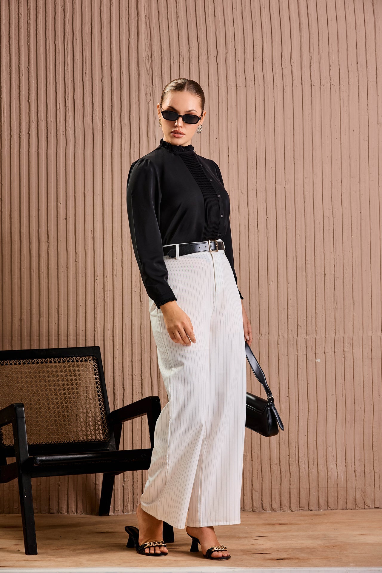Designed for elevated everyday dressing, this top features delicate pintuck detailing along the front that adds subtle texture and structure to the silhouette. The high neckline and softly tailored sleeves create a clean, polished look suitable for modern workwear. Easy to style tucked in or worn loose, it pairs effortlessly with tailored pants or skirts. This piece balances precision and ease, making it a timeless essential for confident, refined dressing from office hours to after-hours.