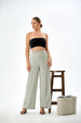 This trouser features a high-waisted fit that cinches the waist, flowing down into an unstructured, wide-leg cut. This full-length, straight-drape silhouette creates an elongated and fluid line, offering a polished yet incredibly comfortable aesthetic. The fabric appears to be a smooth, soft-draping material like a crepe or fine polyester blend, which allows the wide legs to move beautifully without clinging.