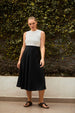 this garment is a timeless, two-tone dress that combines sharp contrast with a comfortable silhouette. The top and bottom are split into striking sections, offering a polished, versatile look. The material of the dress feels smooth and moderately weighty, providing structure, especially in the skirt portion, while allowing a comfortable stretch in the bodice.