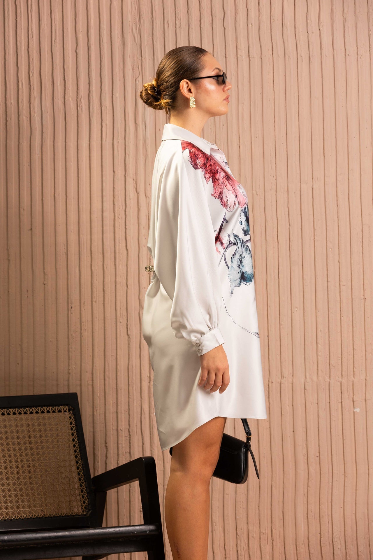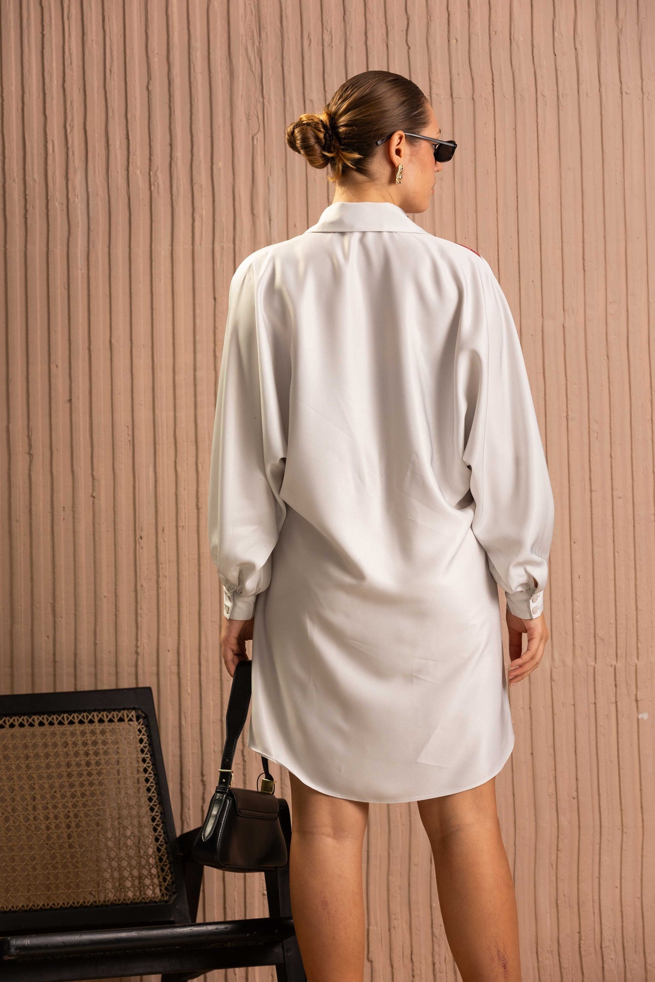 Designed with a relaxed silhouette, this shirt dress blends structure with softness for effortless everyday dressing. Featuring a classic collar, button-down front, and gently gathered sleeves, it offers ease without compromising polish. The fluid fall enhances movement, making it suitable for long workdays or styled-down evenings. A versatile piece that transitions seamlessly between professional and casual settings, crafted for comfort, confidence, and modern femininity.