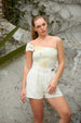The material feels structured and sturdy, giving the garment a tailored, premium look while still being comfortable for warm weather. The design features a high-rise waist and a generous length, hitting mid-thigh. They include key functional details like front pleats for a great drape and side utility pockets. A small, contrasting dark logo patch is visible near the waistband, adding a modern, branded touch to the classic silhouette.
