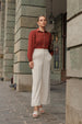 This is an elegant, tailored blouse that combines timeless sophistication with delicate detailing. It features a classic shirt collar and full-length sleeves with subtle gathers at the shoulder for a softly structured look. The front placket is highlighted with scalloped edge detailing and matching buttons, adding a refined feminine touch. Expertly crafted for a flattering fit, this blouse pairs effortlessly with both formal and smart-casual outfits. Made from a smooth, lightweight woven fabric, it ensures comfort and a polished finish throughout the day, perfect for workwear or chic everyday styling