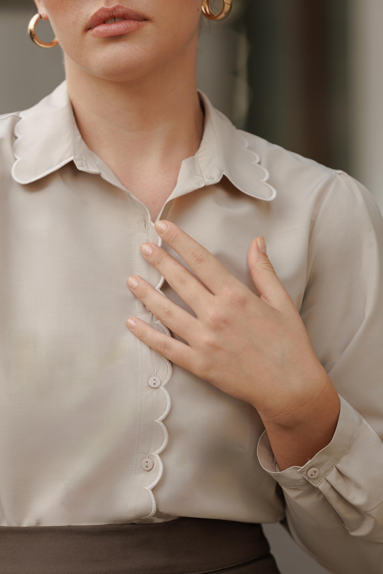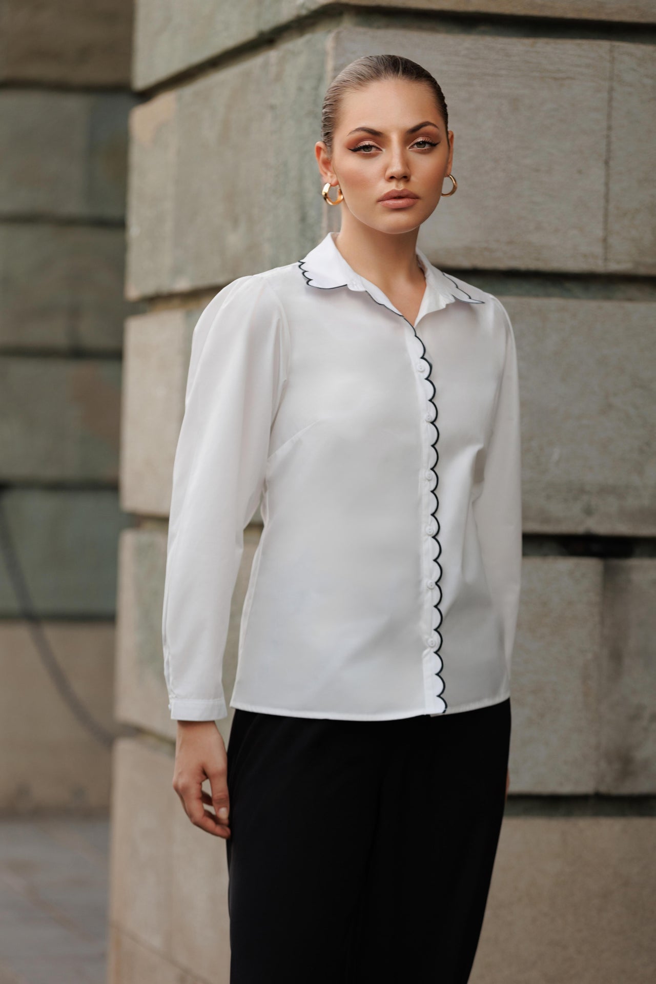 This is an elegant, tailored blouse that combines timeless sophistication with delicate detailing. It features a classic shirt collar and full-length sleeves with subtle gathers at the shoulder for a softly structured look. The front placket is highlighted with scalloped edge detailing and matching buttons, adding a refined feminine touch. Expertly crafted for a flattering fit, this blouse pairs effortlessly with both formal and smart-casual outfits. Made from a smooth, lightweight woven fabric, it ensures comfort and a polished finish throughout the day, perfect for workwear or chic everyday styling