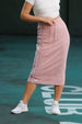 Elevate your off-duty style with this ribbed midi fitted skirt, designed for comfort and edge. Crafted from soft, stretchy rib fabric, this skirt hugs your silhouette while offering ease of movement. The sporty white tape detailing along both side seams adds a bold, athletic-inspired touch. Featuring an elasticated waistband with an adjustable drawcord, it blends functionality with fashion—perfect for styling up your everyday athleisure look. Pair it with a crop top or hoodie and sneakers for effortlessly cool vibes.