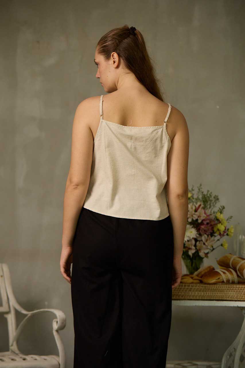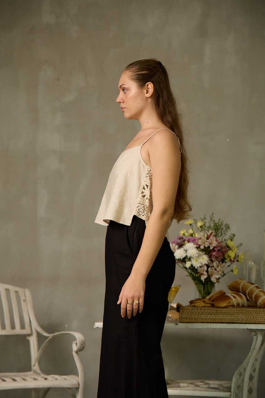 This strappy top is crafted from breathable linen-cotton fabric for cool, all-day comfort. Designed with adjustable straps for a customizable fit, it features delicate side lace detailing that adds a touch of feminine charm. The loose-fitted silhouette drapes beautifully, making it perfect for warm-weather days, beach outings, or layered looks. Effortlessly versatile, this top pairs easily with skirts, shorts, or pants for a relaxed yet stylish summer staple.