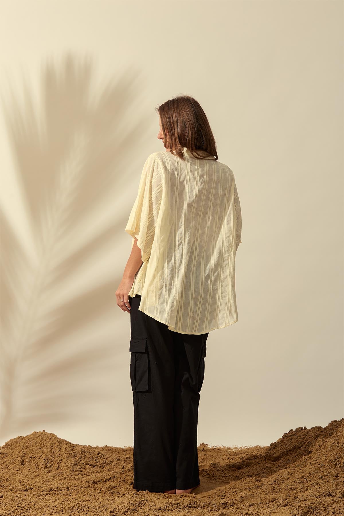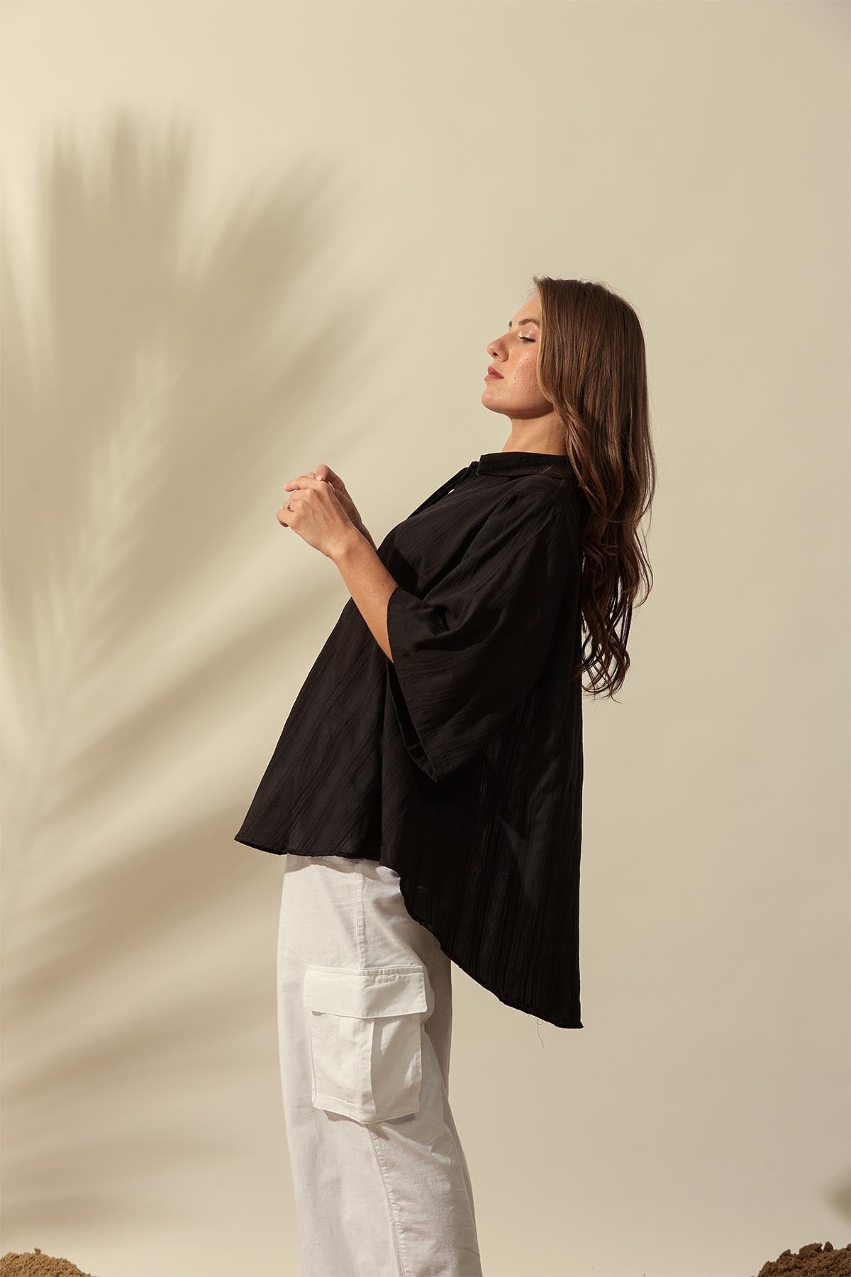 Crafted from breathable textured cotton fabric, this elbow-length sleeve top offers lightweight comfort with a relaxed, loose-fitted silhouette. The button-down front adds a classic finish, making it an easy, versatile piece for effortless everyday style.