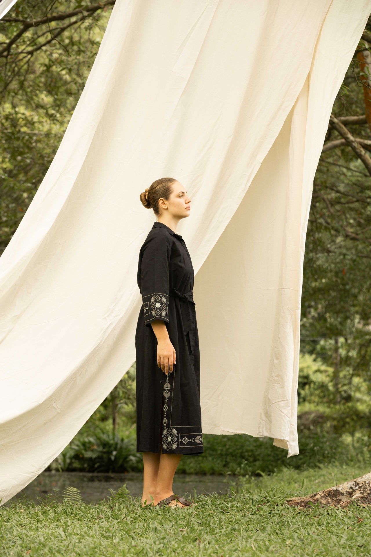 This elegant midi-length dress blends timeless style with refined craftsmanship. Designed with delicate embroidery detailing and a flattering button-down front, it offers effortless sophistication for any occasion. The waist tie detail accentuates your shape while ensuring a comfortable fit. Made from breathable fabric, its long sleeves and soft texture make it perfect for both casual and semi-formal settings, adding grace and comfort to your everyday wardrobe.